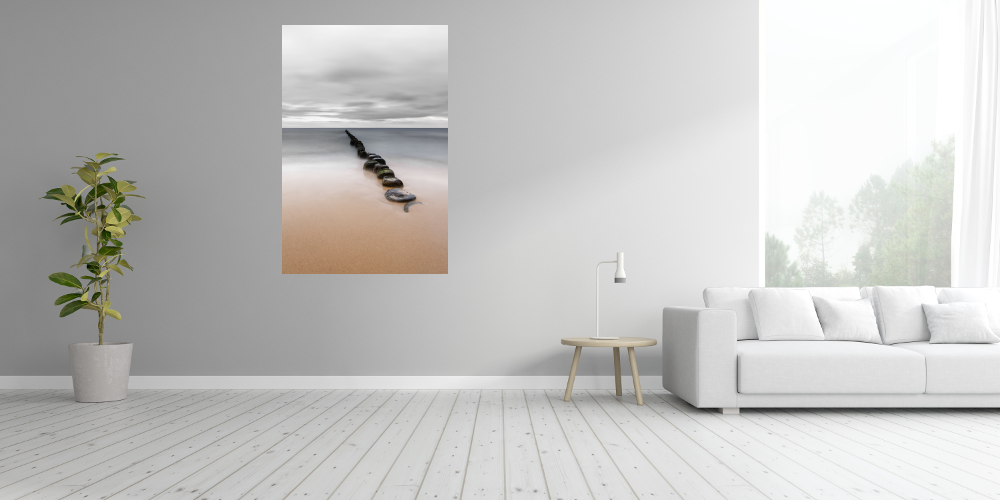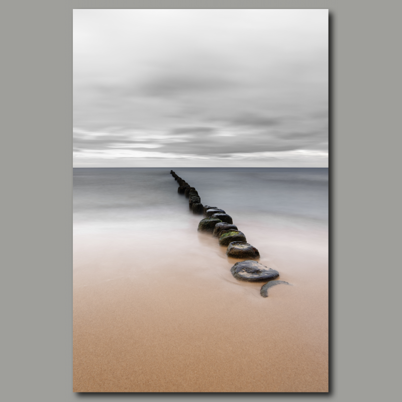 Photo de plage calme de la côte de la mer Baltique où une rangée d'épis guide le regard vers l'horizon, la surface de l'eau est lissée par une longue exposition, structures nuageuses gris clair