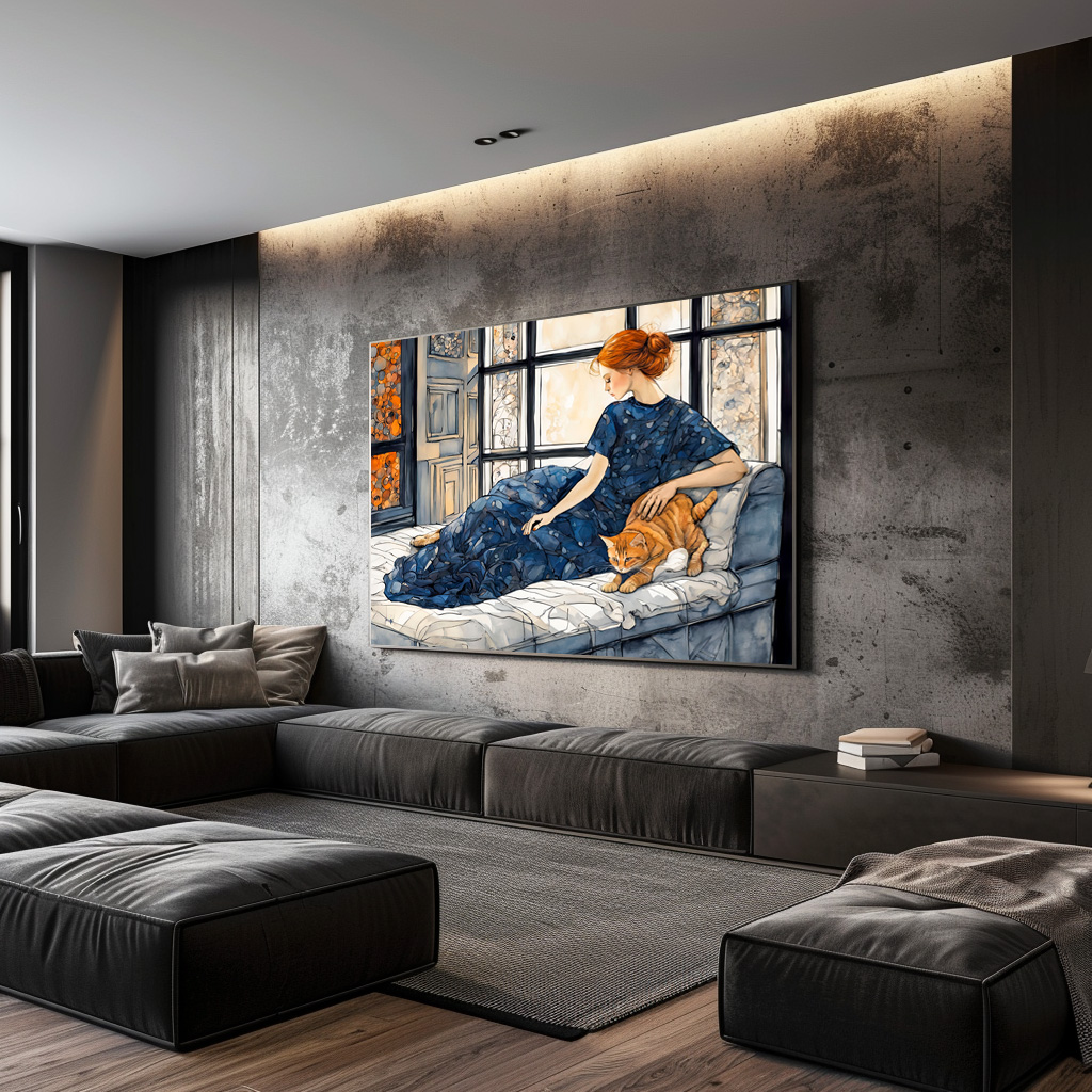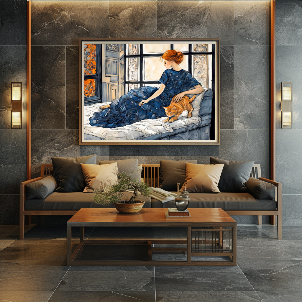 cozy watercolor painting of a woman in a dark dress sitting by a window with her orange cat. Warm light and soft textures create a peaceful atmosphere.
