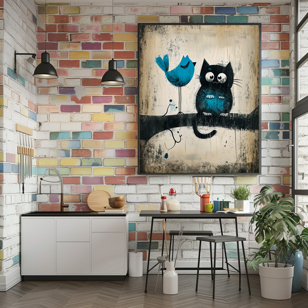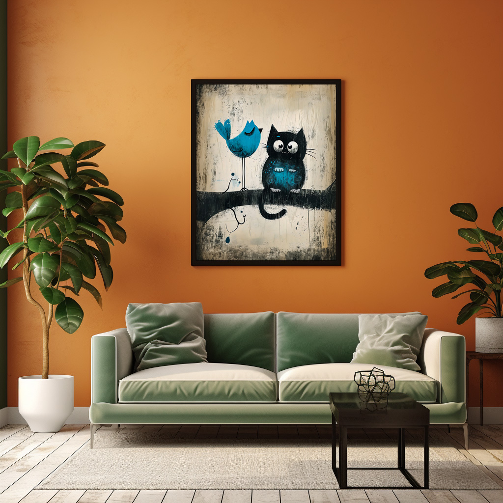 playful illustration featuring a black cat and a blue bird perched on a branch, showcasing a charming and whimsical style with vibrant colors and textured background.