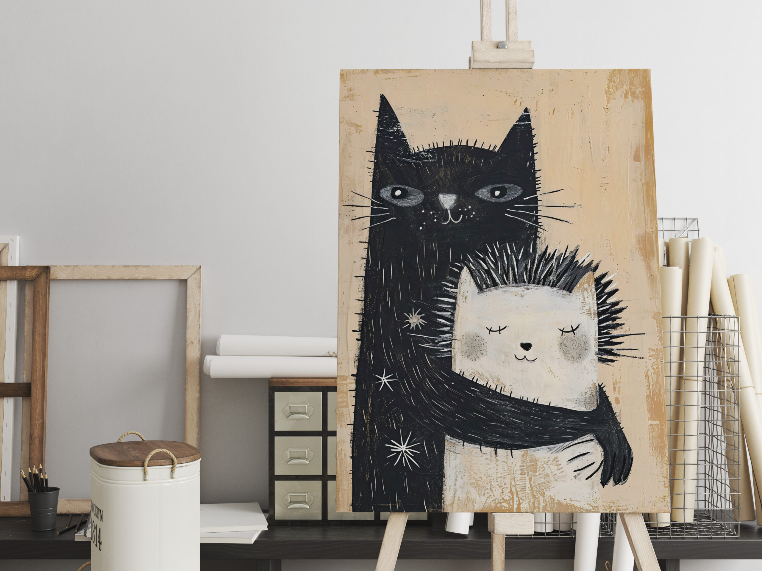 A heartwarming illustration of a black cat gently hugging a hedgehog. The artwork captures a whimsical and affectionate scene with textured details and soft colors.
