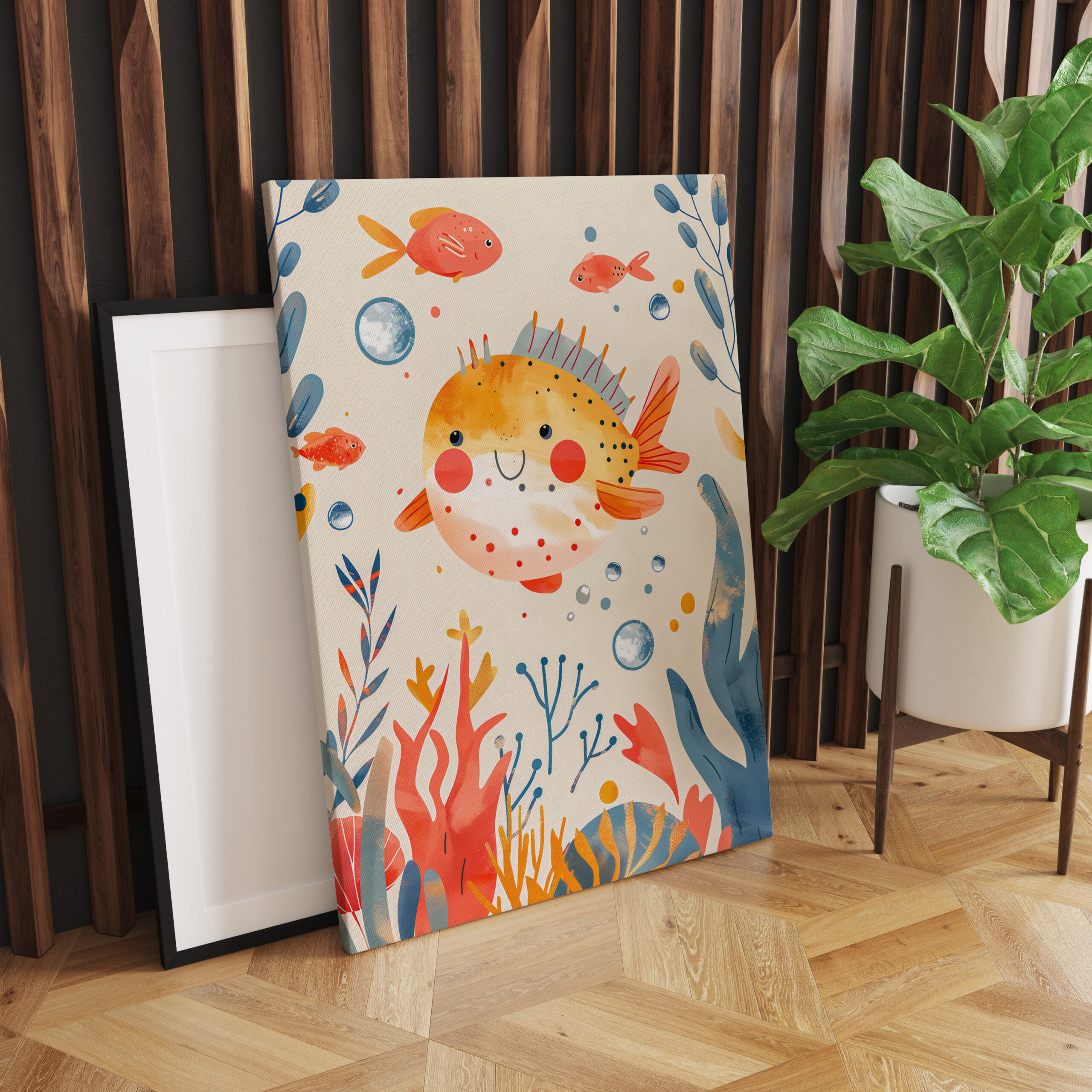 pufferfish swimming near a vibrant coral reef, surrounded by colorful marine life and plants.