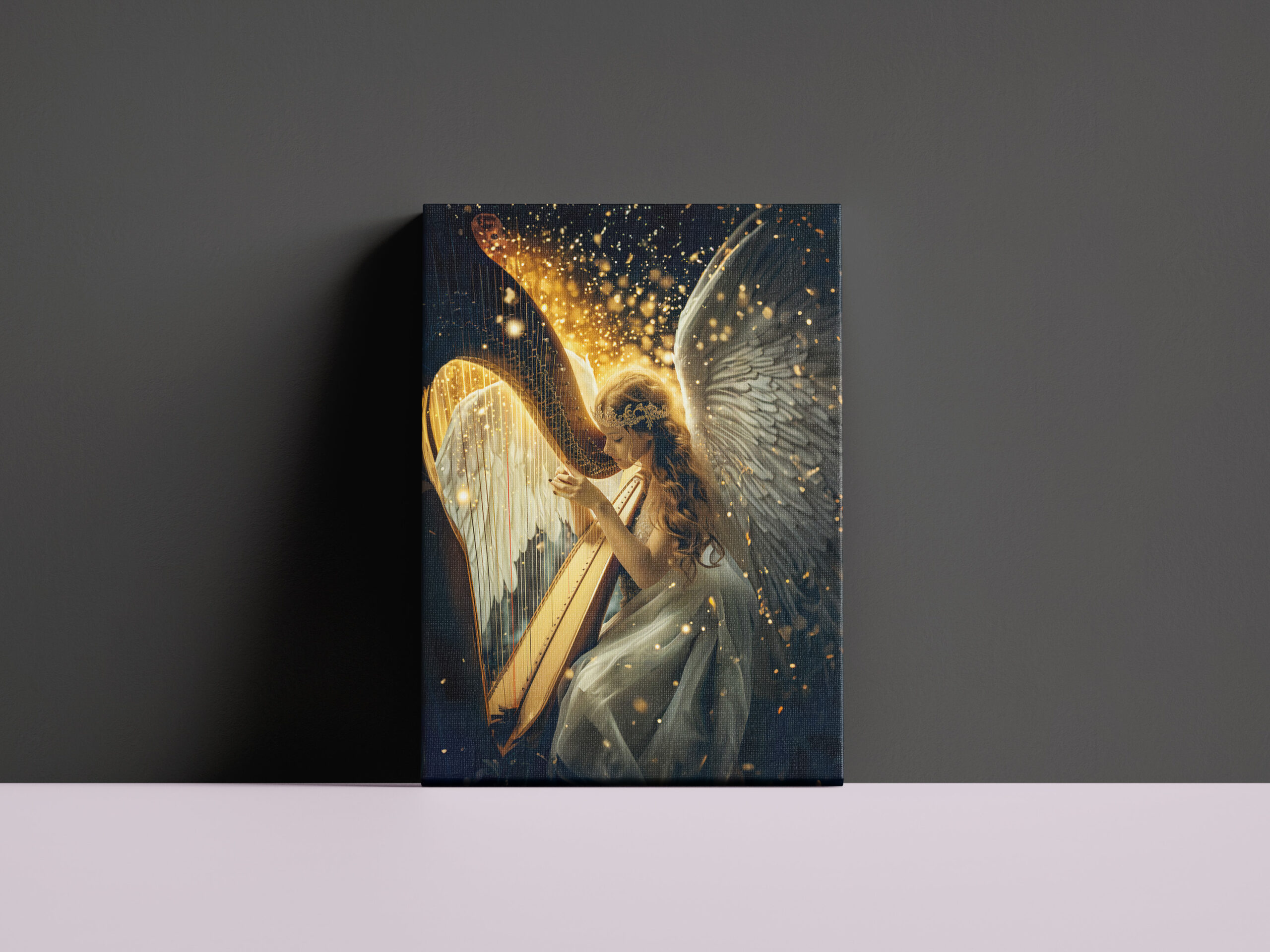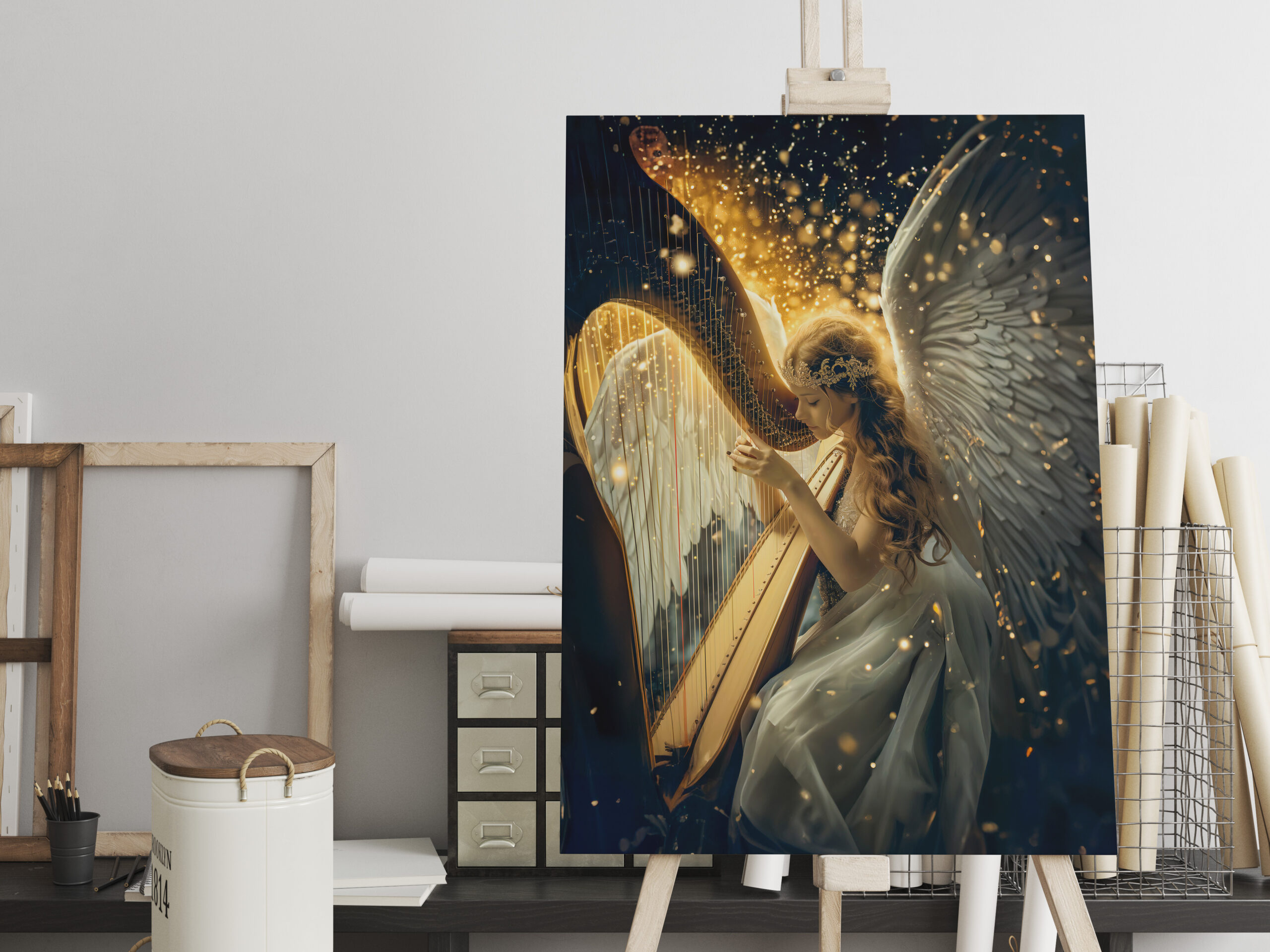 illustration capturing the celestial beauty as an angel delicately plays the harp, weaving a tapestry of heavenly melodies that resonate with ethereal grace. Immerse yourself in the divine harmony of this celestial musician