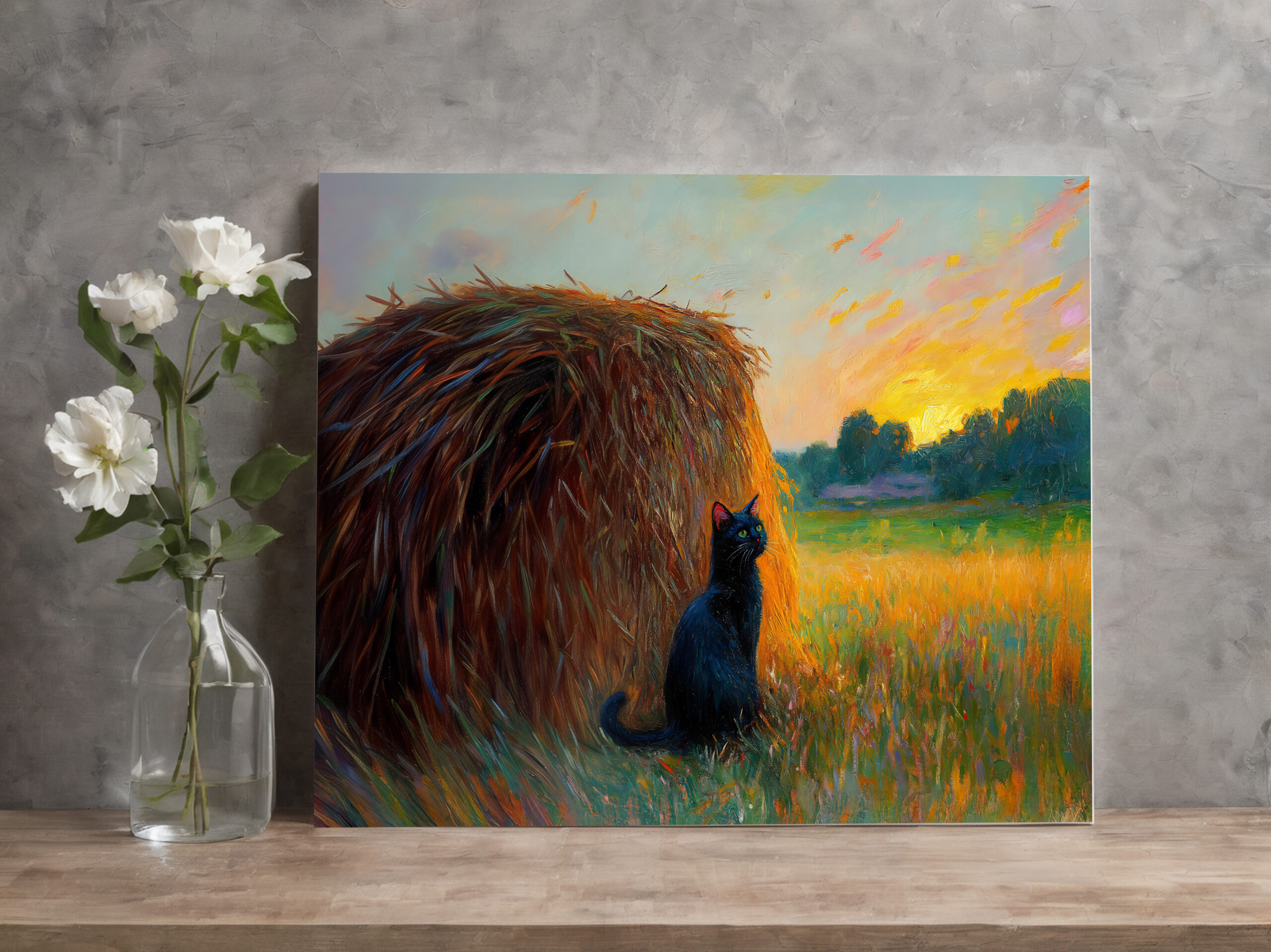 An impressionistic oil painting featuring a cat sitting beside a haystack on a meadow during a golden sunset. Warm tones and textured brushstrokes evoke a serene countryside scene.