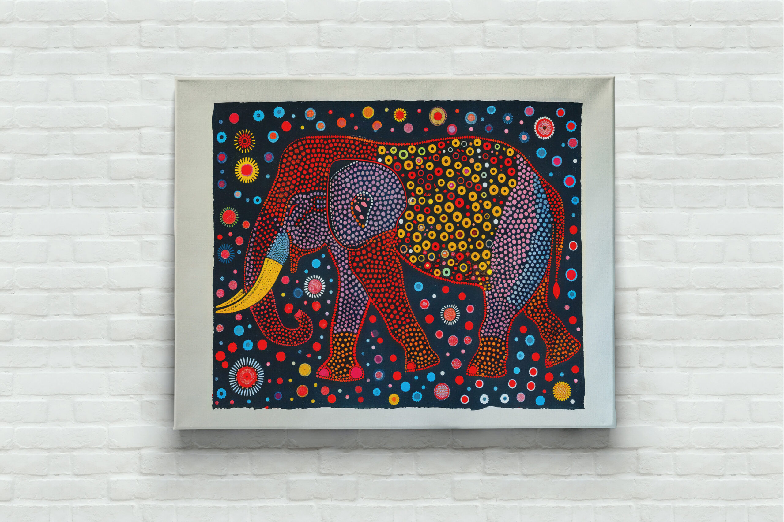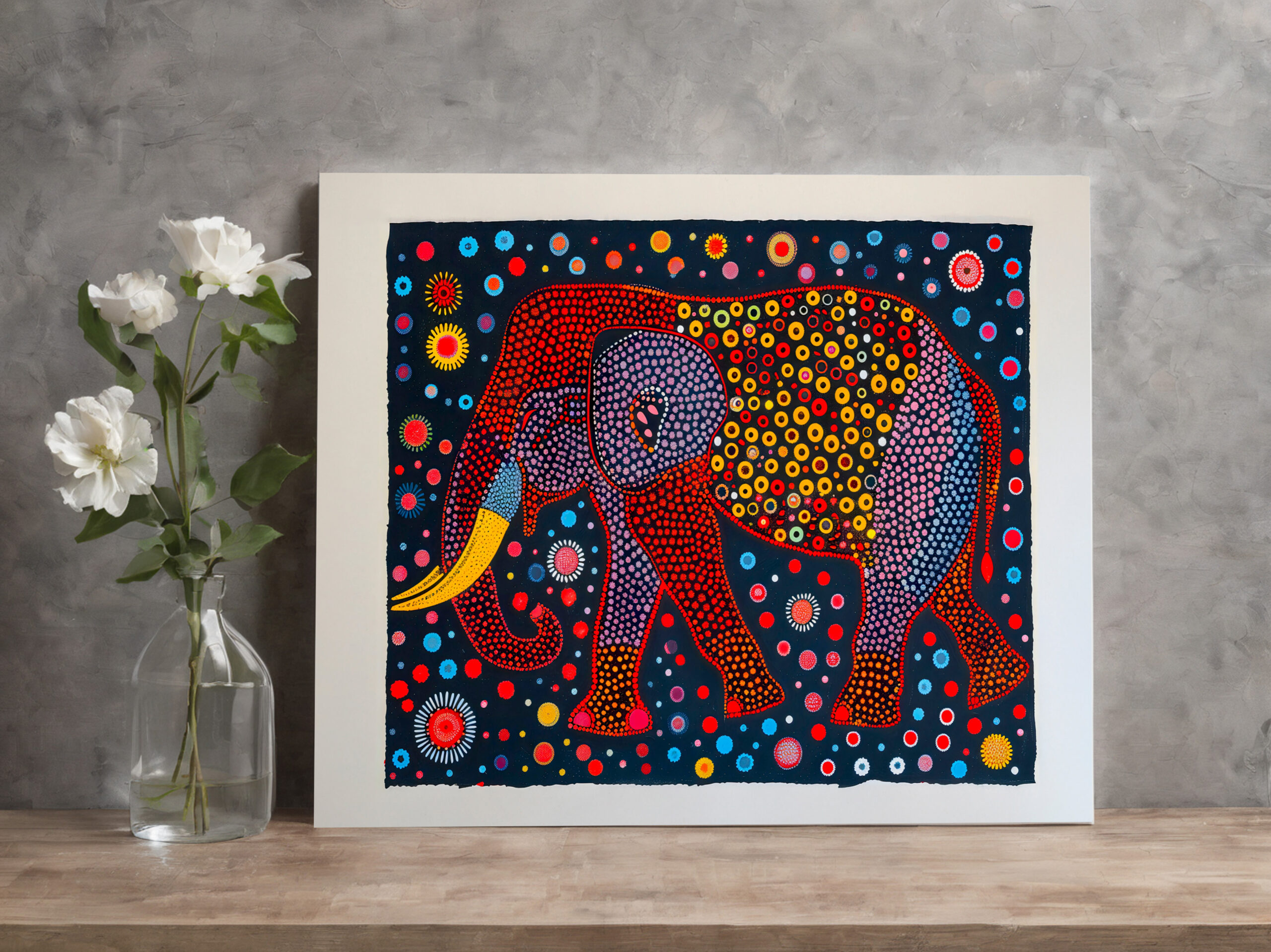 A stylized red blue elephant artwork with red and yellow flower dots on a deep blue background. Playful abstract design with a modern pop art influence.