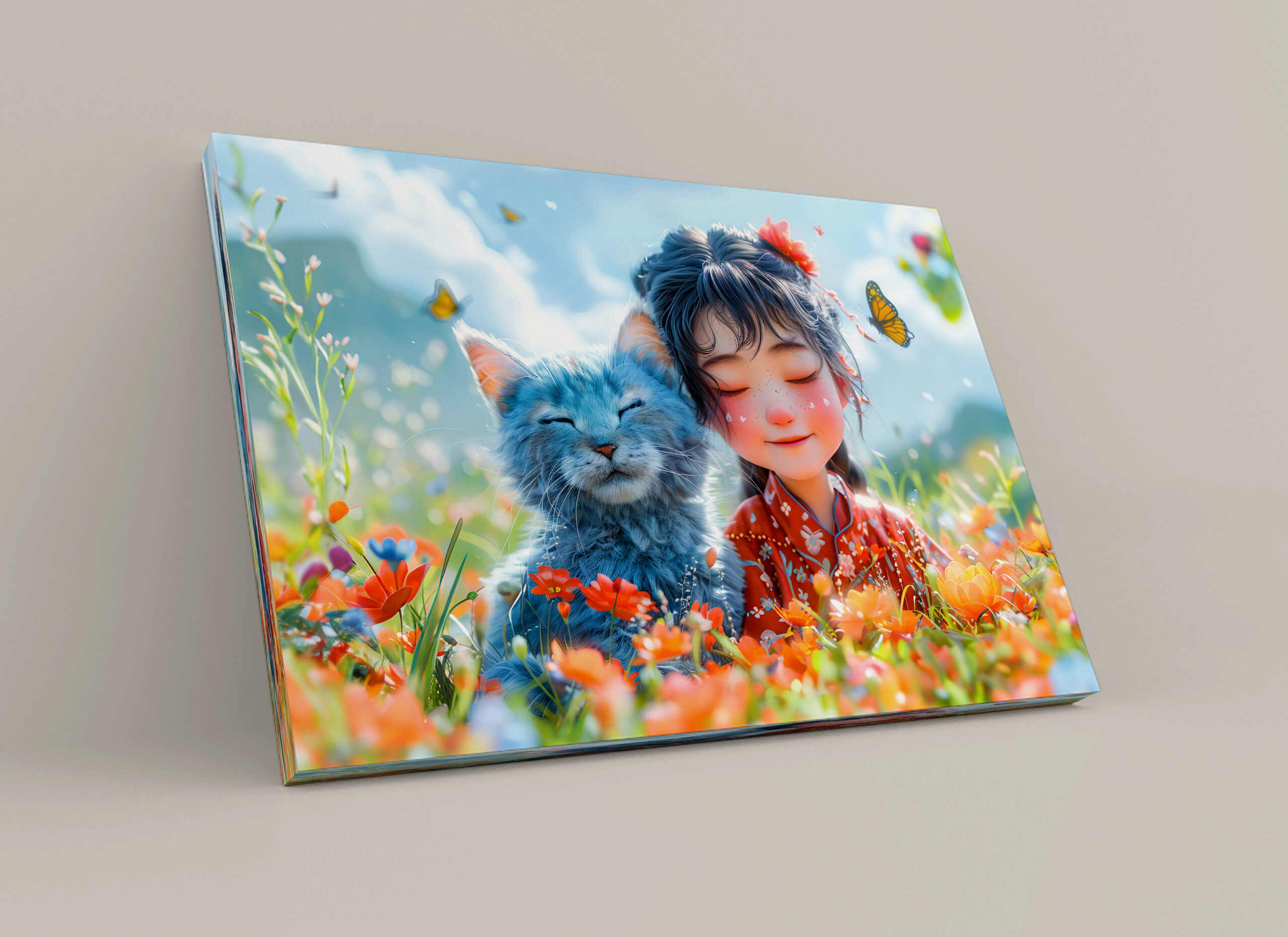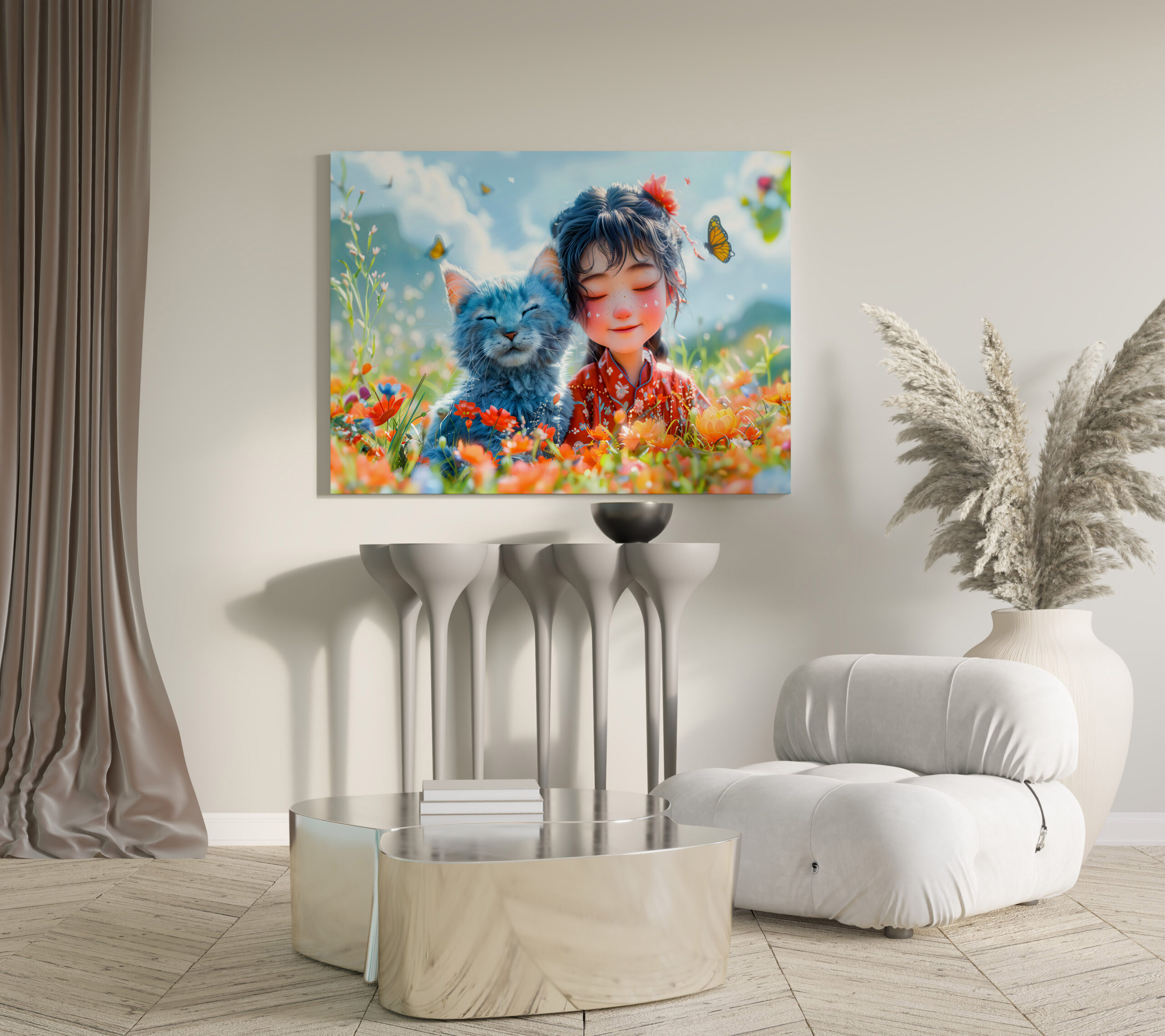 A dreamy Chinese girl and her cat enjoy a sunny summer day in a flower field. Peaceful and magical moment.