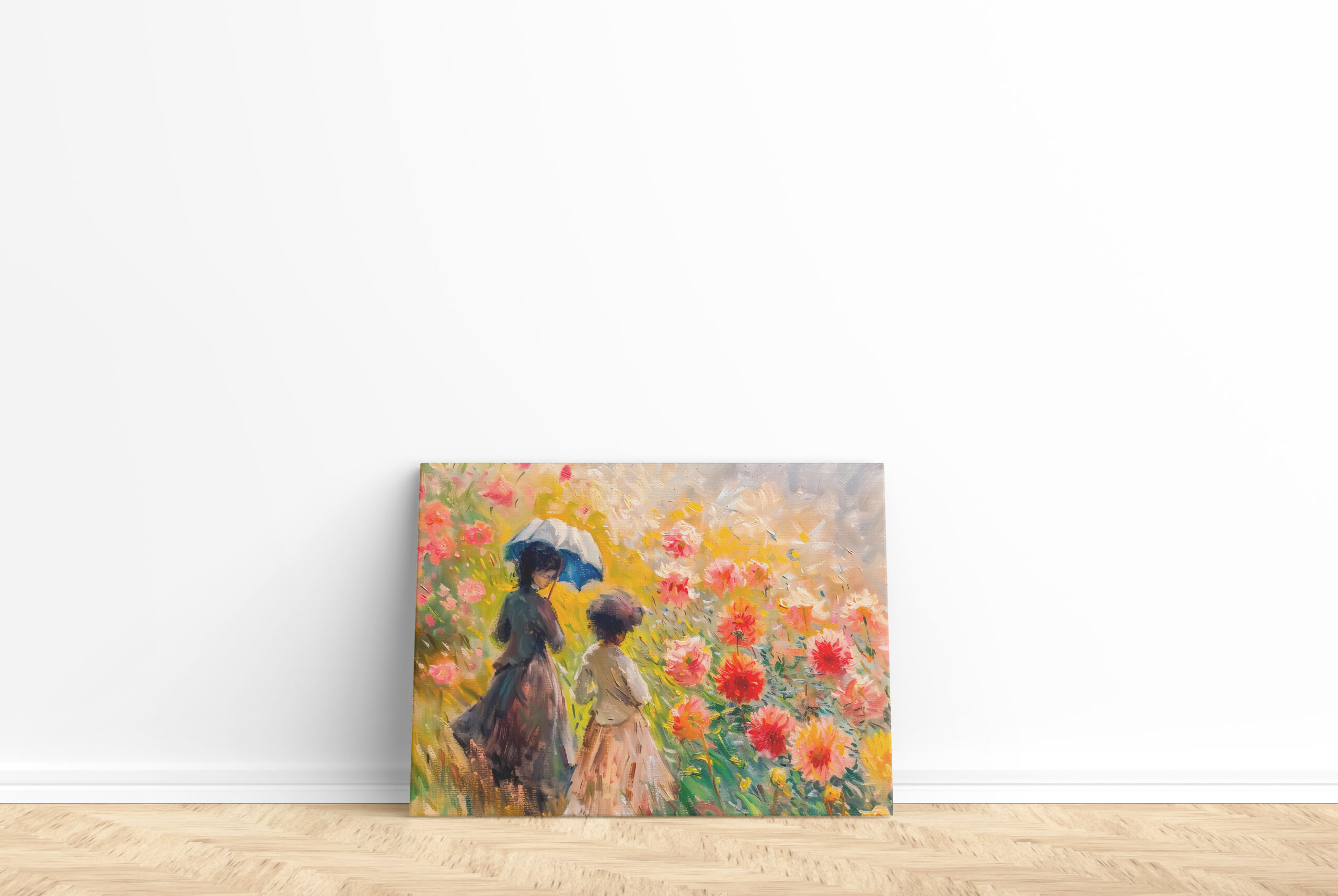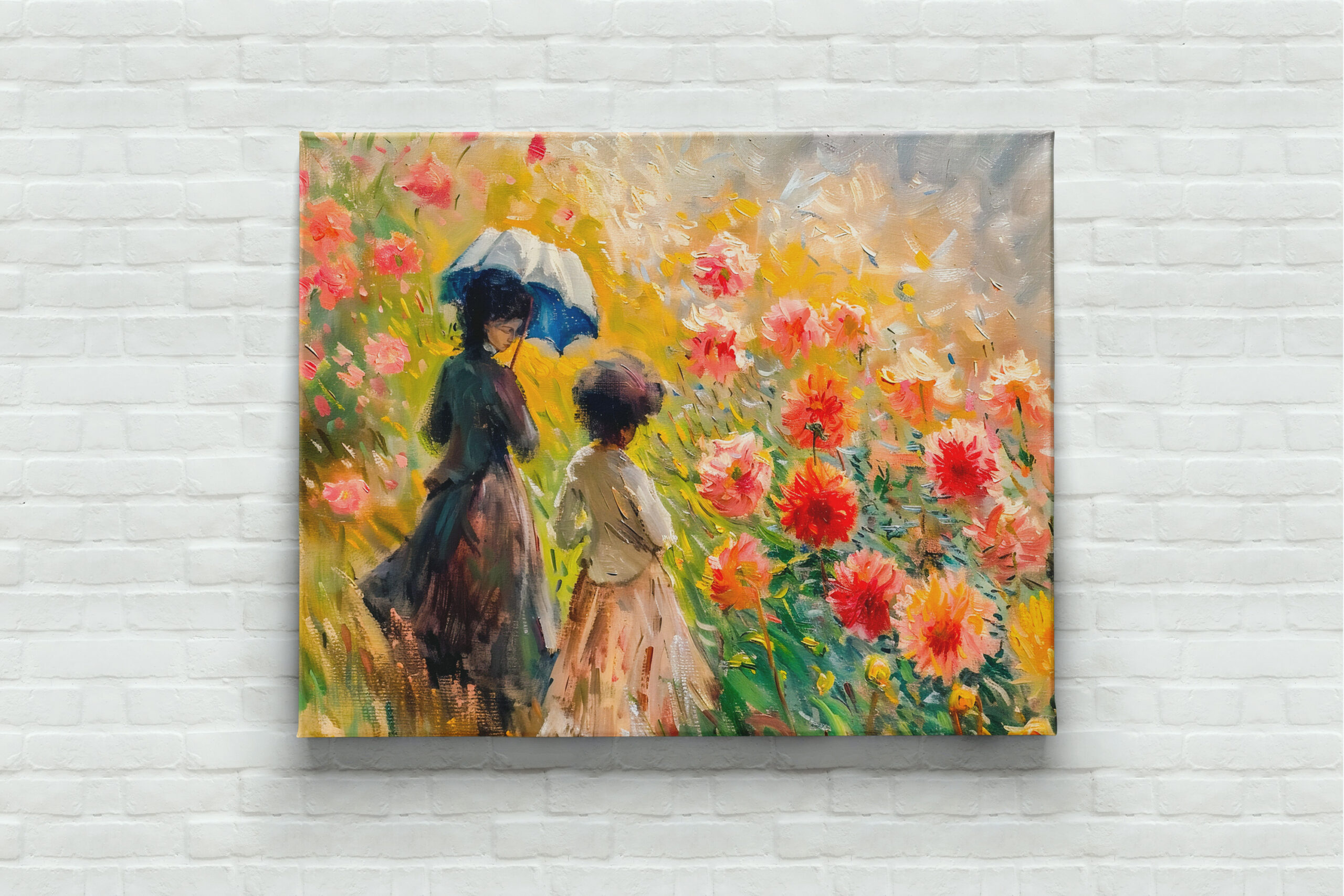 Impressionist painting of two women admiring a vibrant dahlia flowerbed in a blooming summer garden.