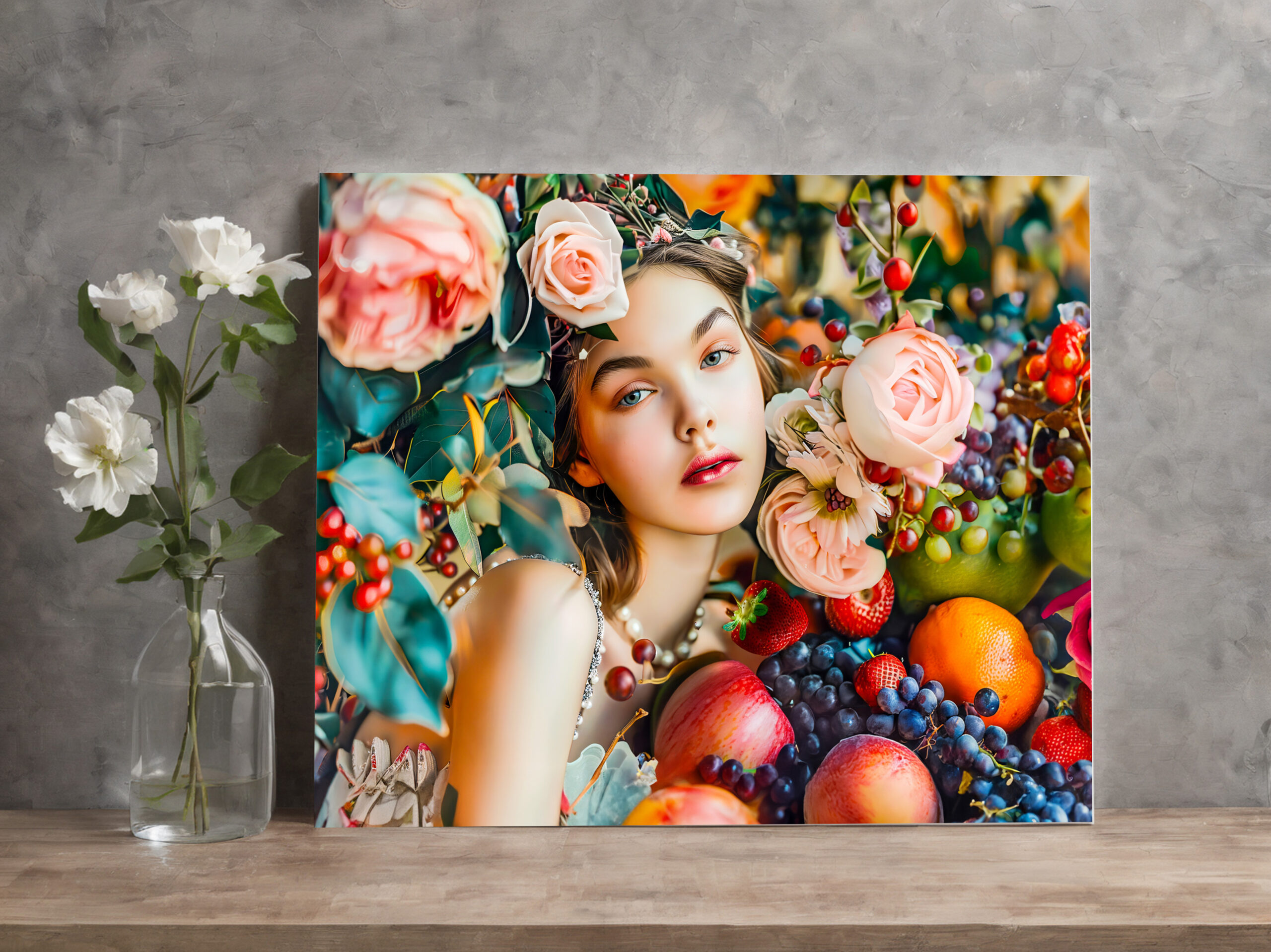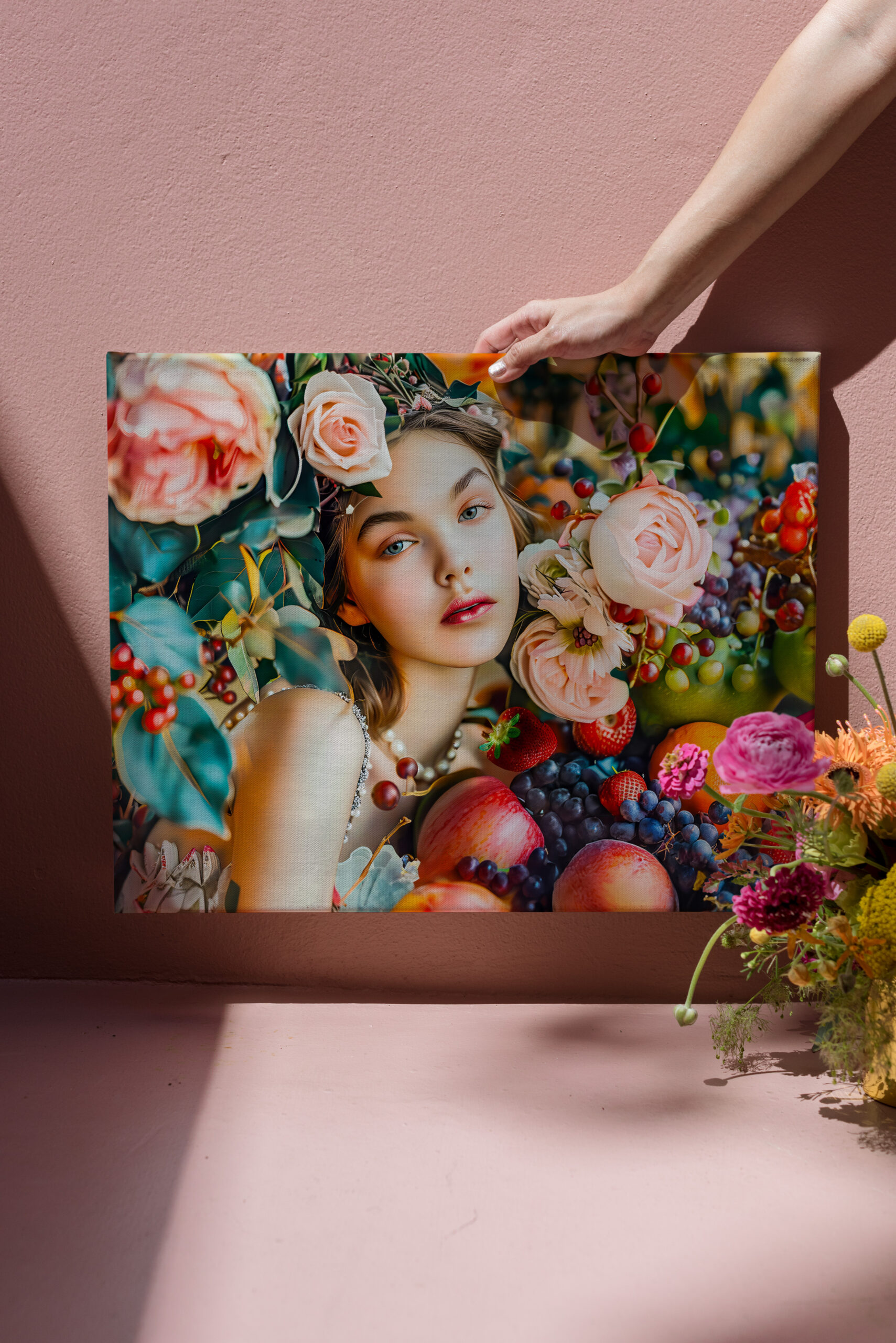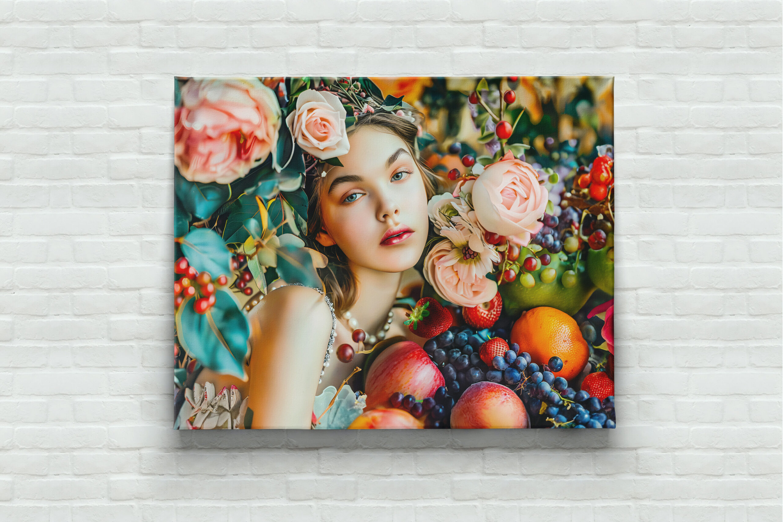 A woman surrounded by floral rose decorations and fruits. The portrait blends natural textures, vibrant colors, and elegant styling in a serene setting.