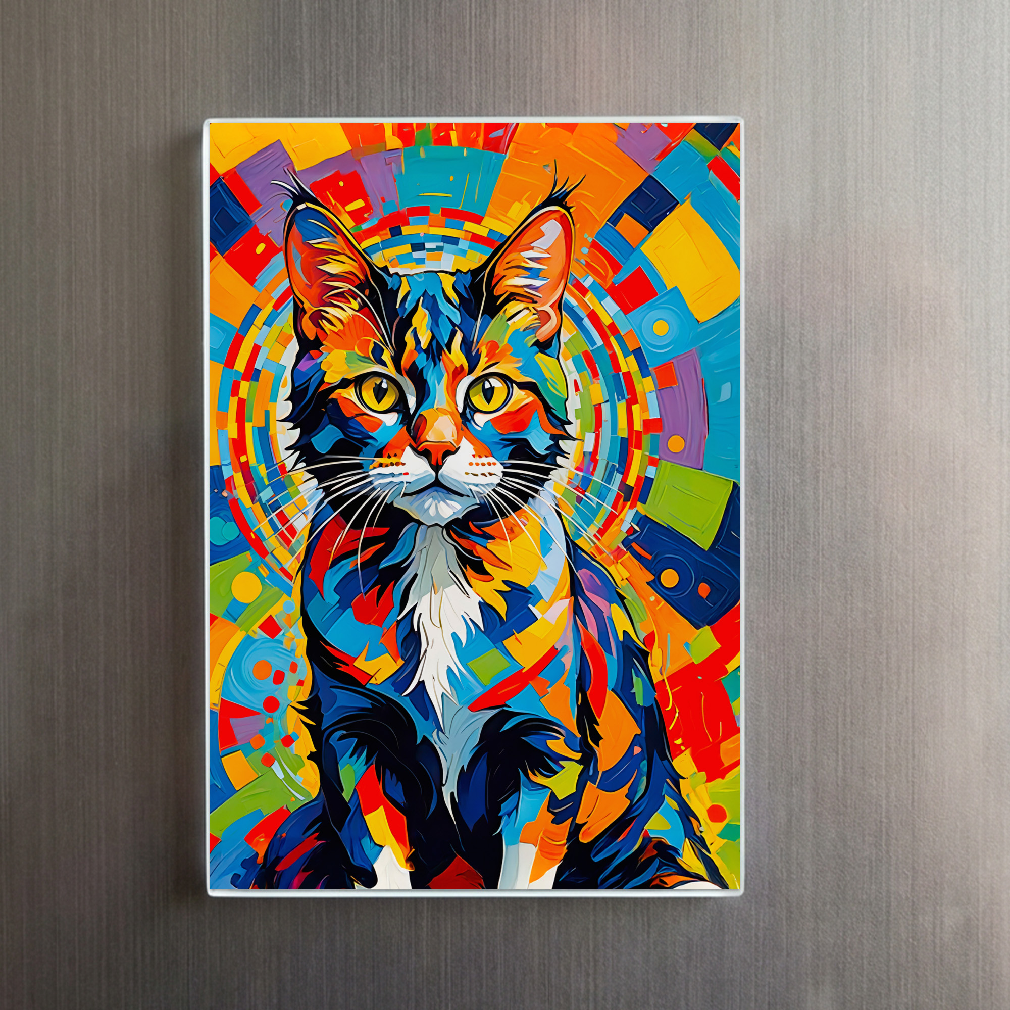 Eye-catching abstract cat painting with vibrant colors and geometric shapes.