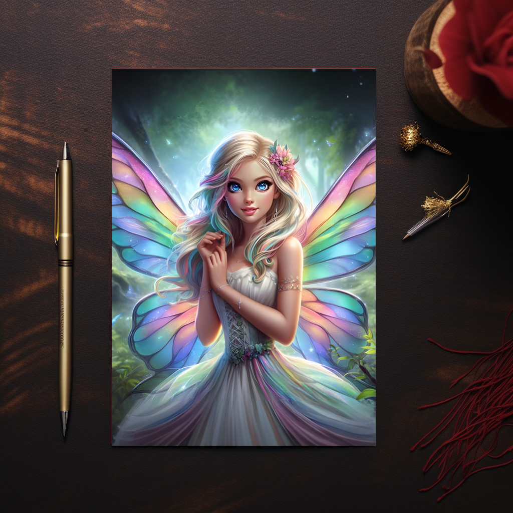 La ravissante fée blonde, Elara, orne la forêt de sa magnifique robe blanche. Ses ailes colorées scintillent dans des tons pastels éblouissants, tandis que ses yeux bleus reflètent la pureté du ciel. Ses longs cheveux blonds encadrent un sourire enchanteur qui souligne la magie de sa présence.