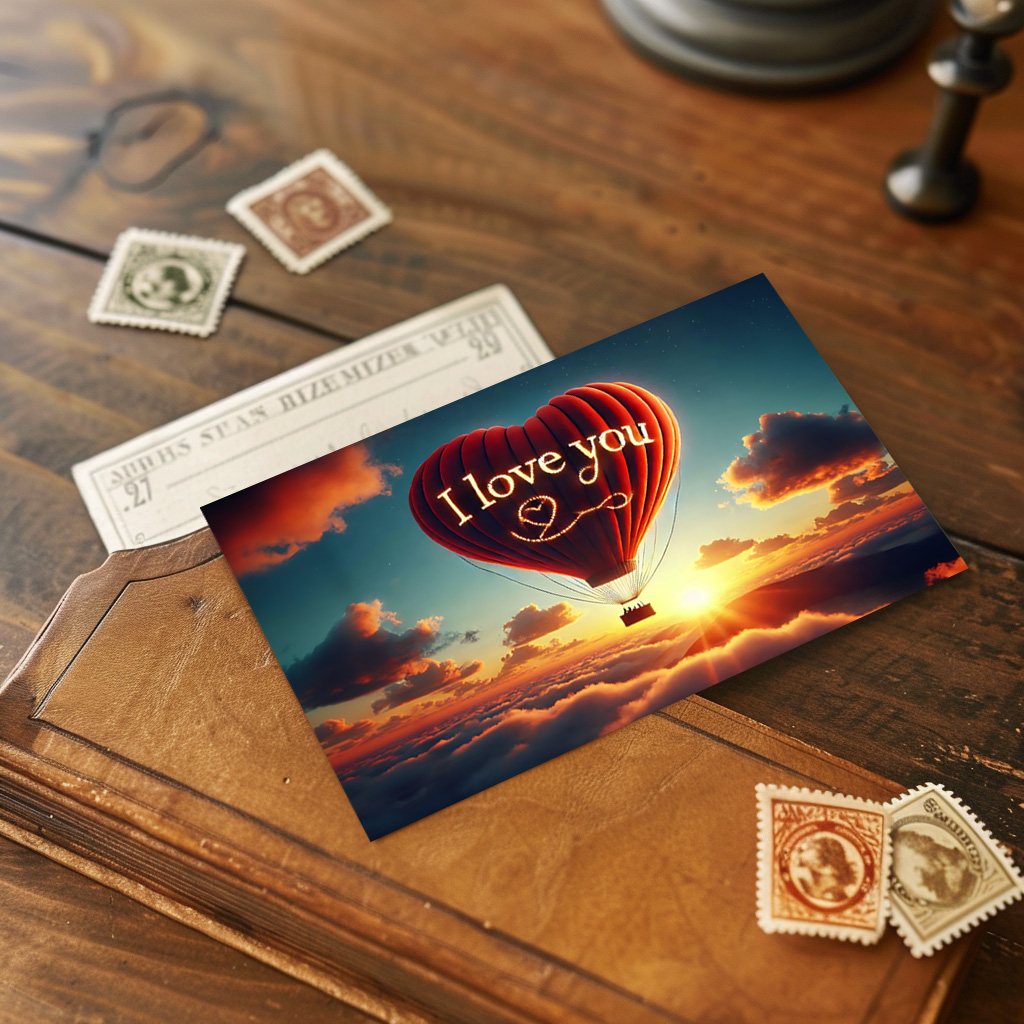 Sur l'image, on voit une montgolfière en forme de cœur qui s'élève dans le ciel. Sur la montgolfière, on peut lire I love you, et en arrière-plan, on peut voir des nuages colorés ainsi qu'un coucher de soleil.