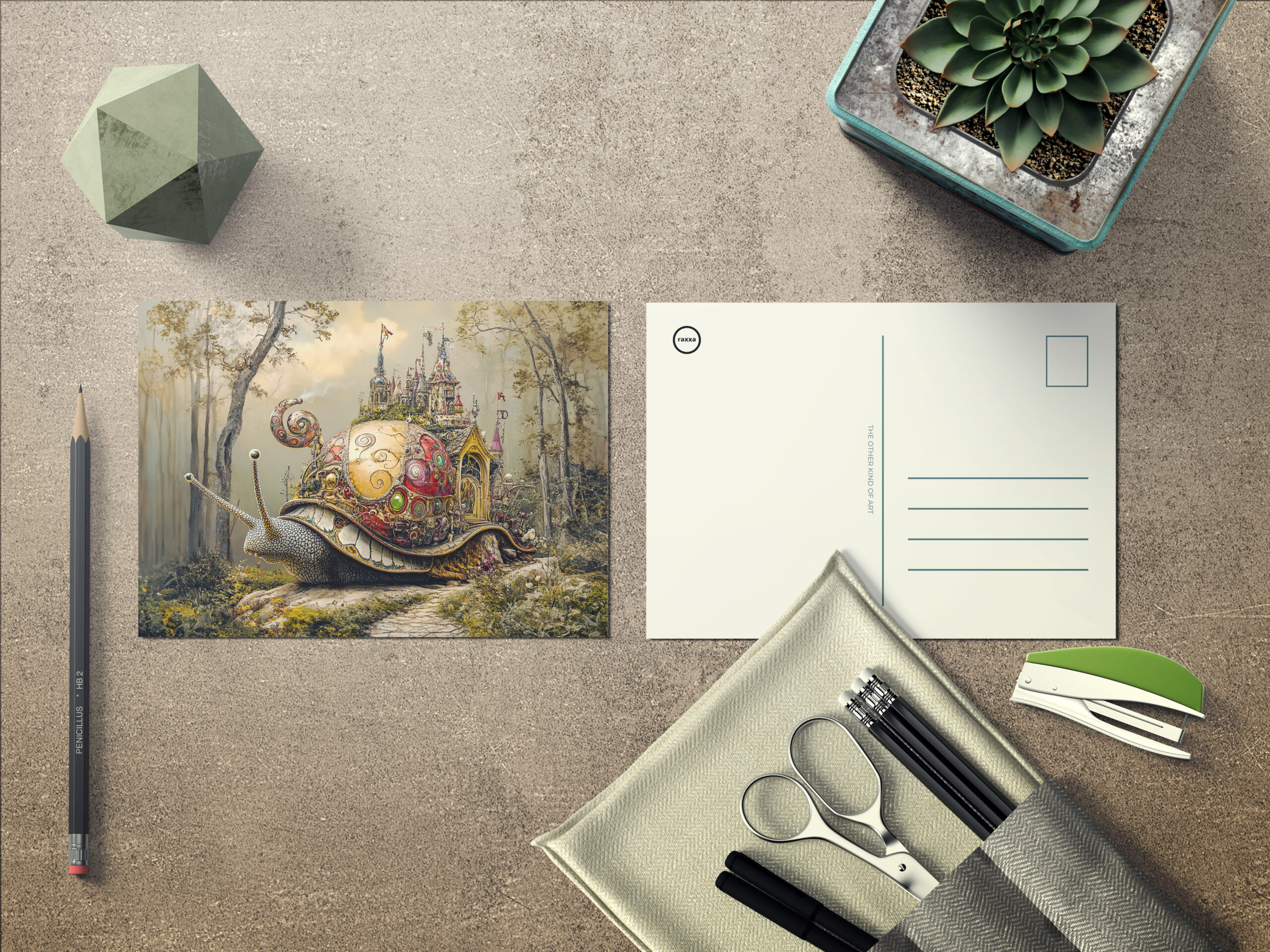 Illustration of a whimsical snail carrying a castle on its shell in a magical forest. Steampunk-inspired fairy tale artwork with surreal and detailed elements.