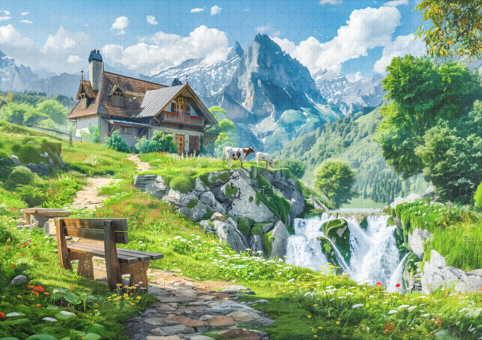 Stunning illustration of a cottage in the Alps near a cascading waterfall, surrounded by lush green mountains. Perfect for nature and travel-themed designs.