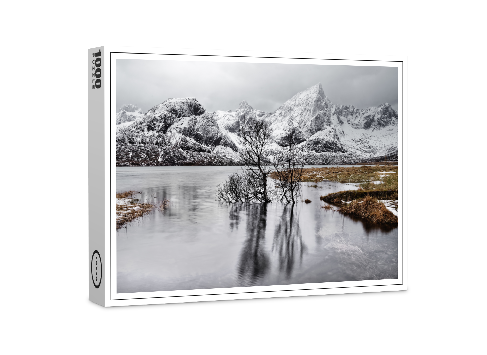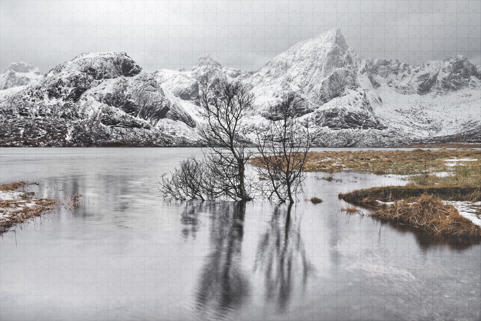 Arbres dans l'eau, reflet marqué, paysage de glace avec montagnes en arrière-plan, ciel gris - Lieu : Norvège, Lofoten
