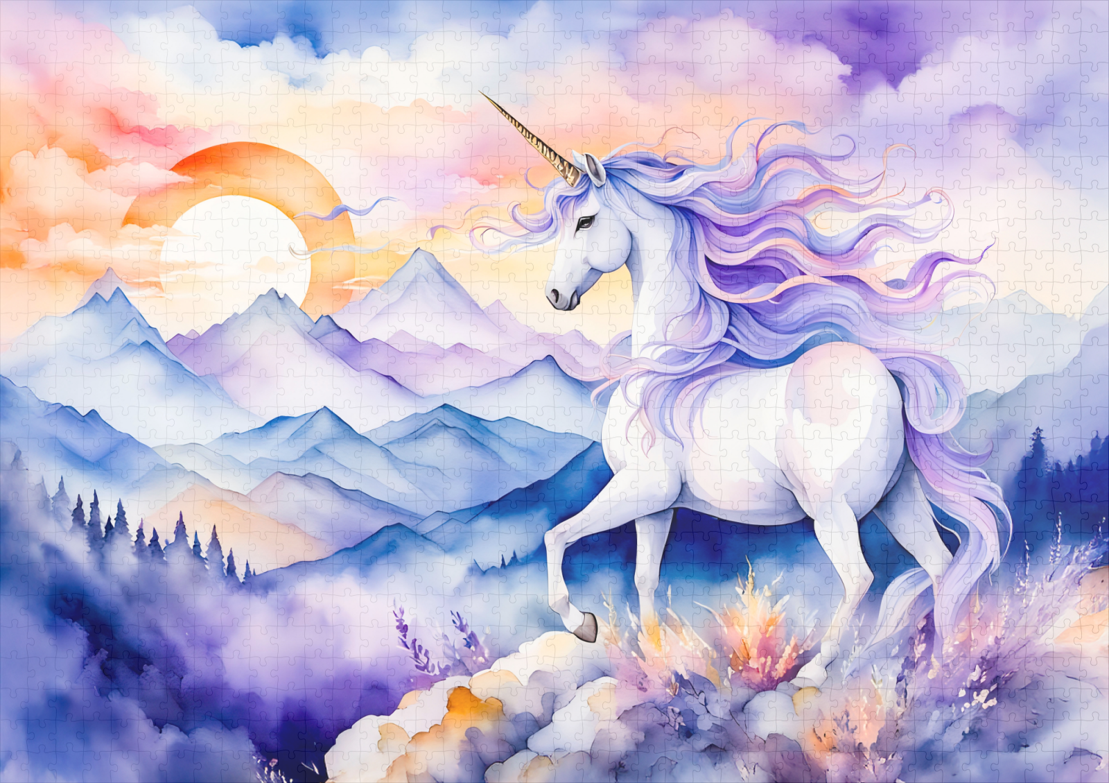 A powerful unicorn stands on a high mountain peak, looking into the dreamy misty distance. Ethereal boho watercolor artwork in soft blues and purples.
