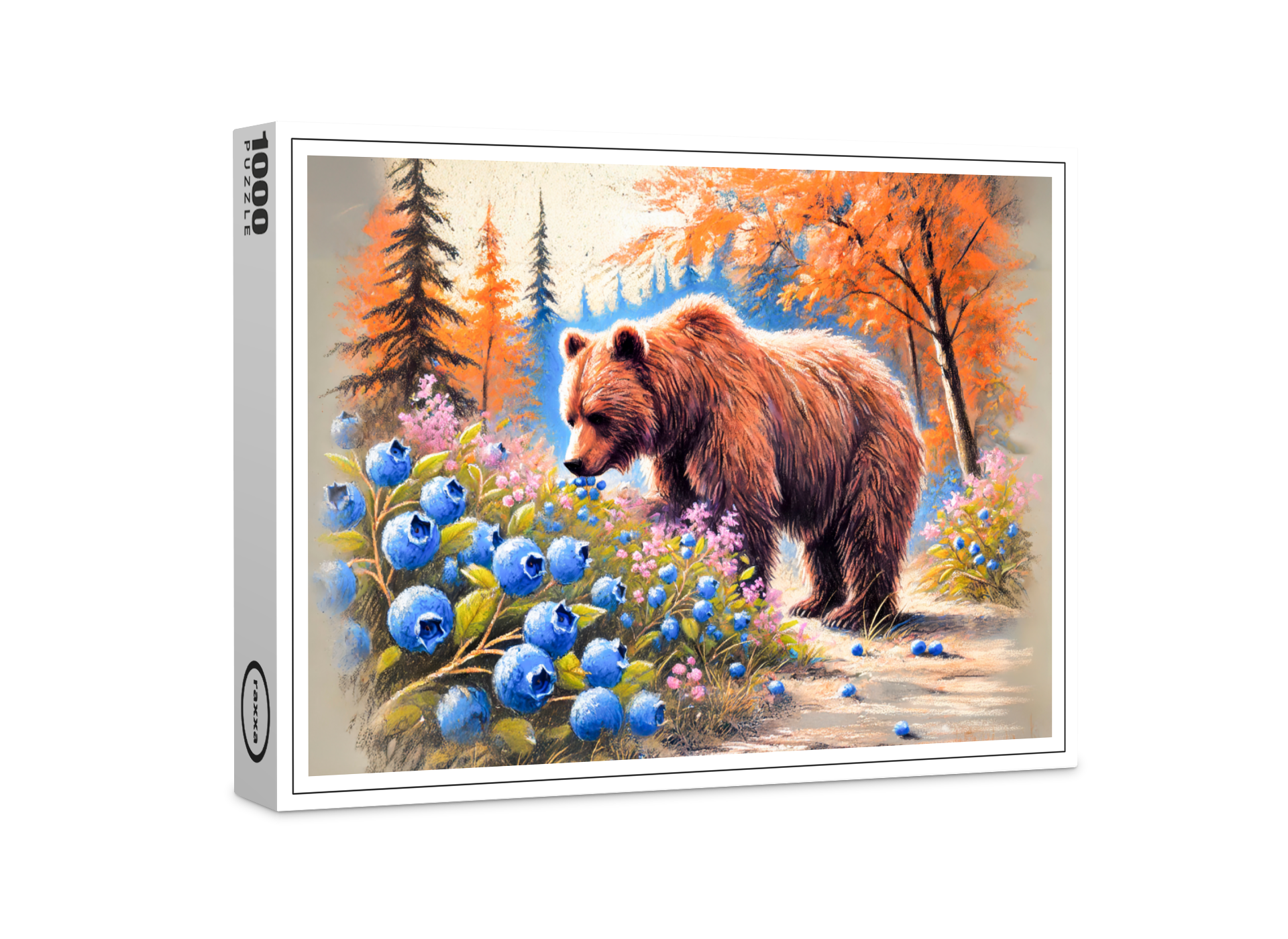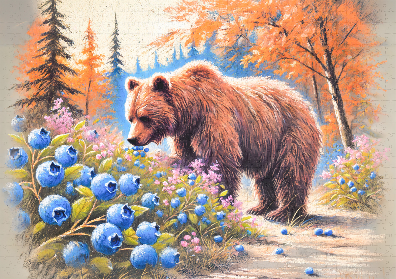 brown bear enjoys blueberries in a serene forest setting, illustrated with soft pastel chalk colors, highlighting the beauty of nature and wildlife.