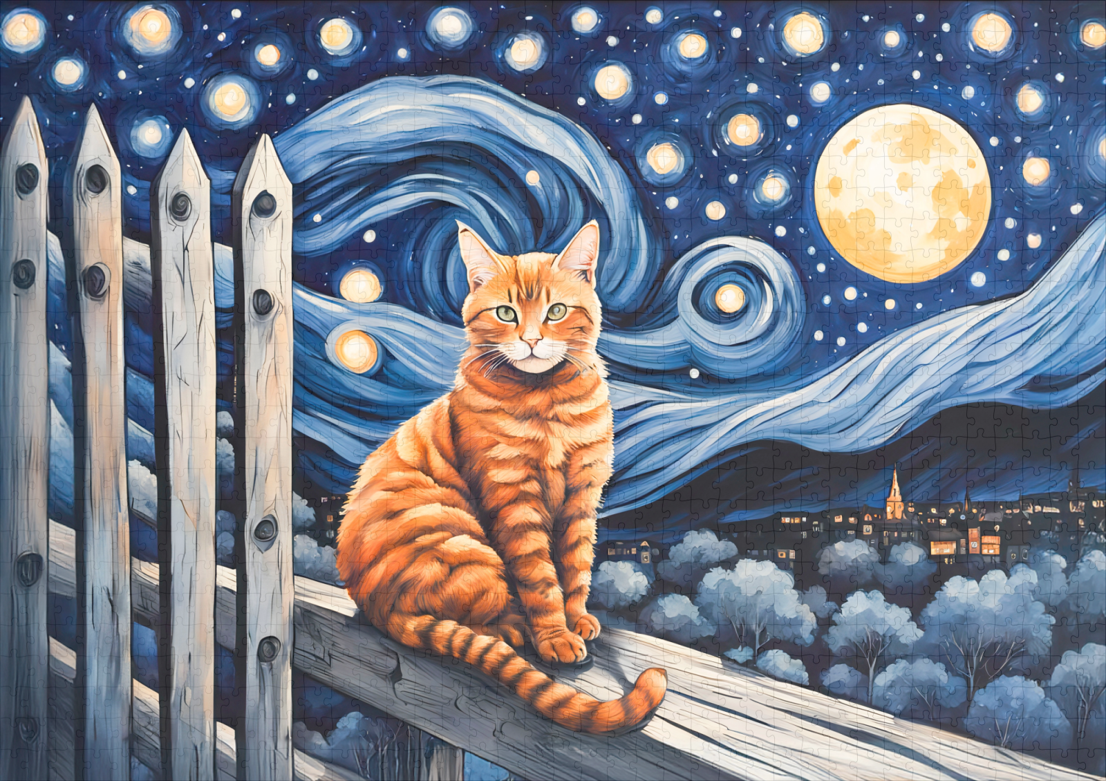 orange cat sits on a fence under a starry night sky.