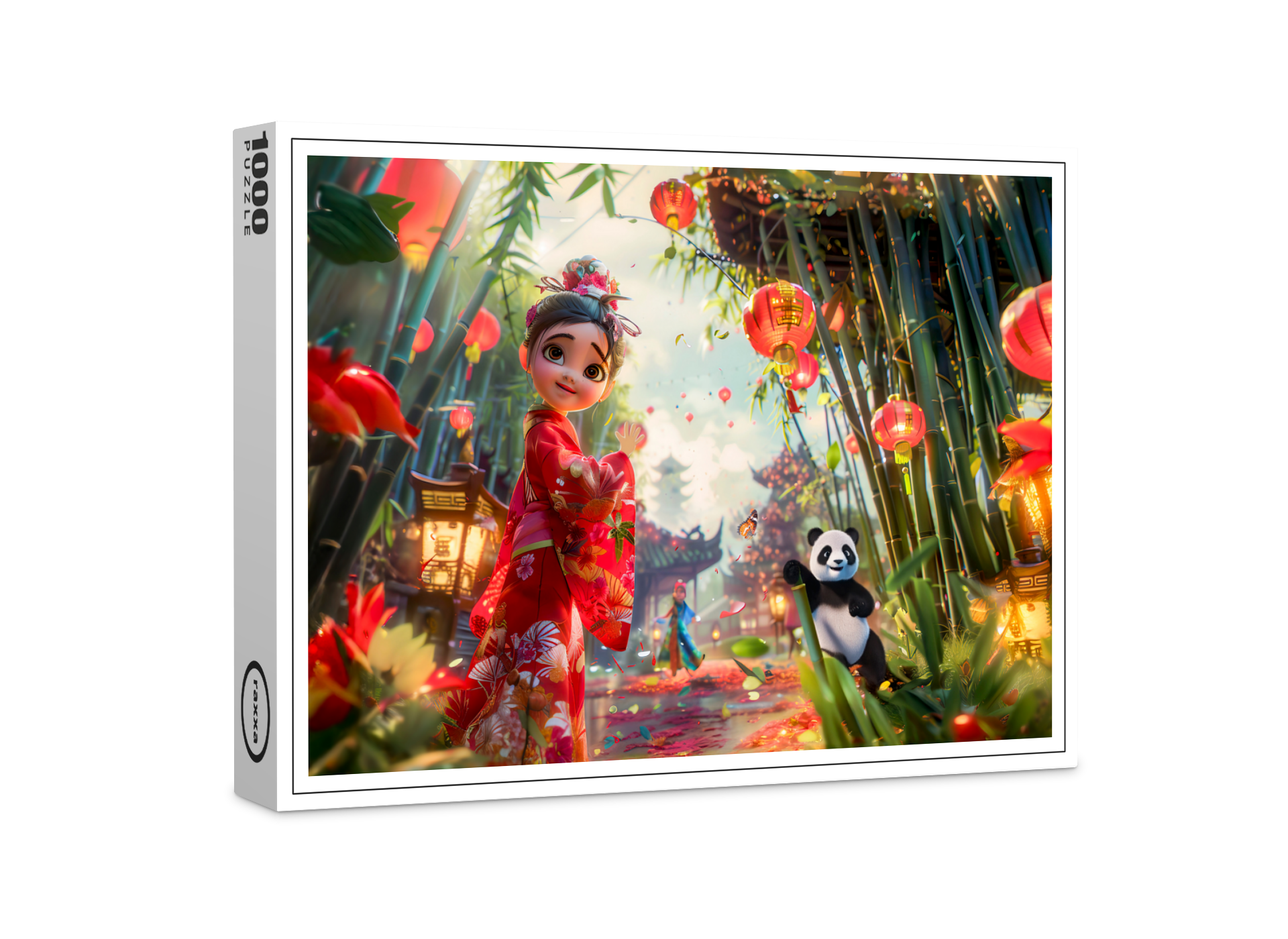 raxxa Premium-Puzzle: Comic Girl in Bamboo Forest with Panda