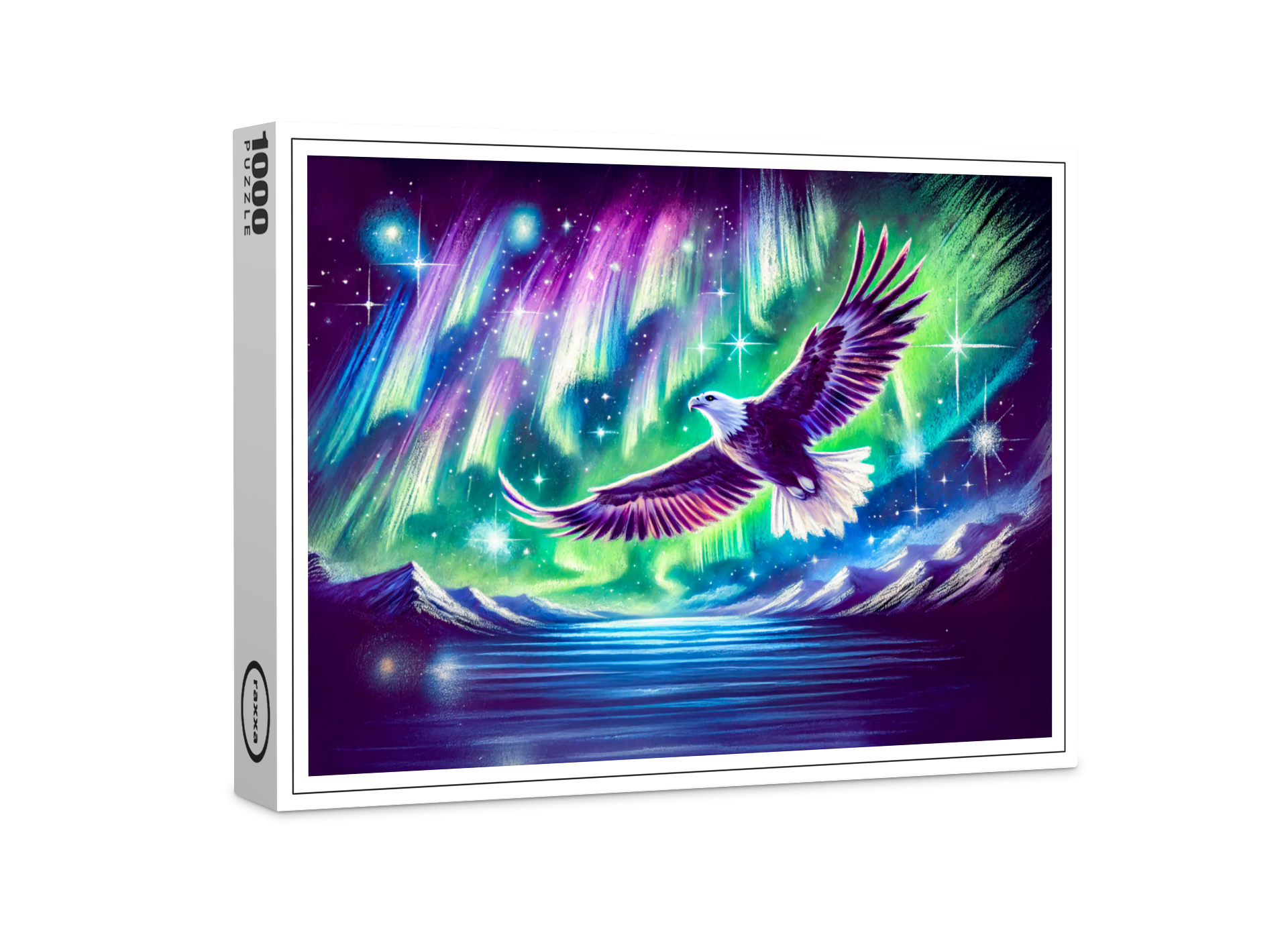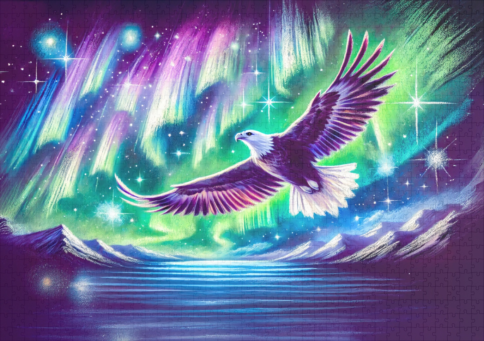 eagle soars over a tranquil mountain lake beneath the vibrant northern lights. This pastel chalk drawing captures the beauty of nature, blending wilderness and celestial magic