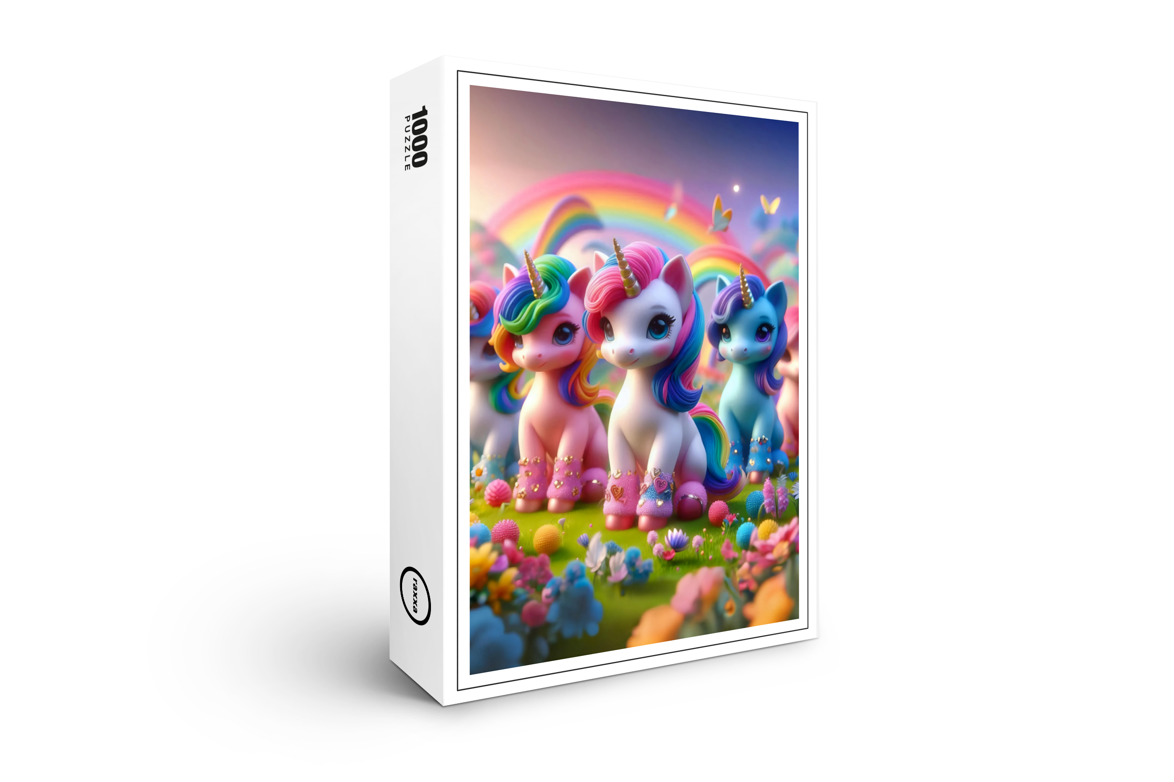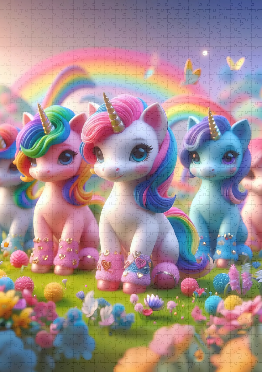 Des licornes 3D multicolores sont joyeusement assises dans une prairie verte, entourées de couleurs vives et d'un arc-en-ciel radieux qui se courbe au-dessus d'elles. Leurs crinières et leurs queues s'illuminent aux couleurs de l'arc-en-ciel et confèrent à la scène un charme magique et ludique. Les licornes rayonnent de satisfaction et de joie et créent une atmosphère magique et joyeuse.