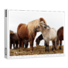 Nahaufnahme einer Gruppe Islandpferde vor einem hellen Hintergrund, eines der Tiere ist ein Fohlen, es schmiegt seinen Kopf an an ein erwachsenes Tier – Location: Island