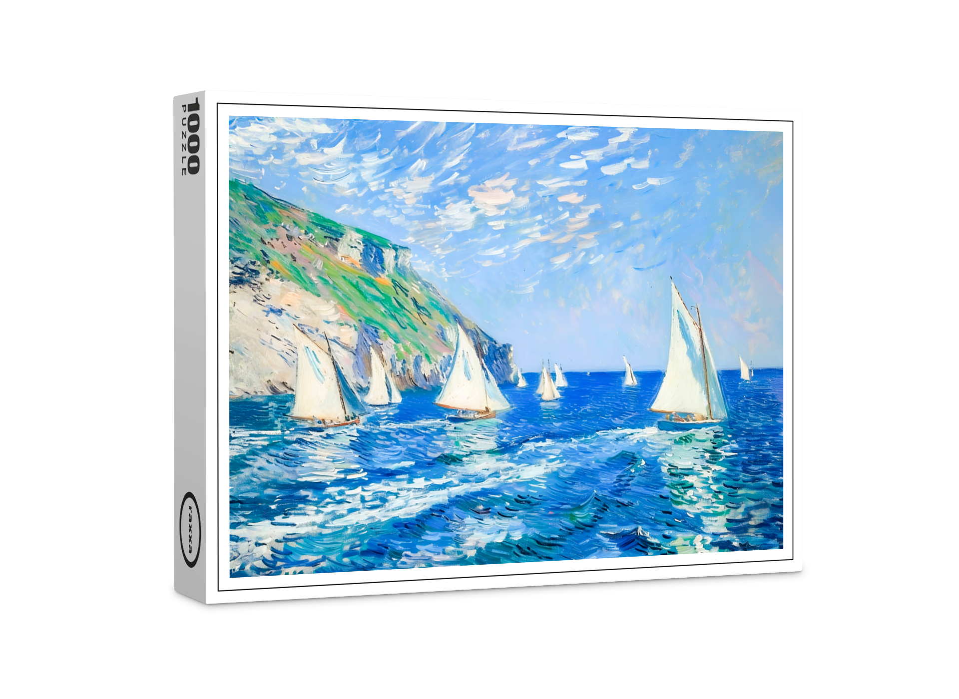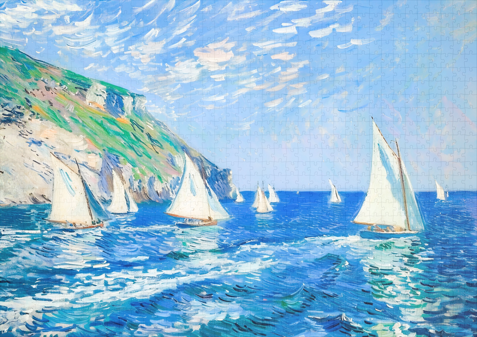 impressionist seascape featuring sailboats gliding on calm blue waters. The soft colors, gentle waves, and warm sunlight create a tranquil maritime scene.