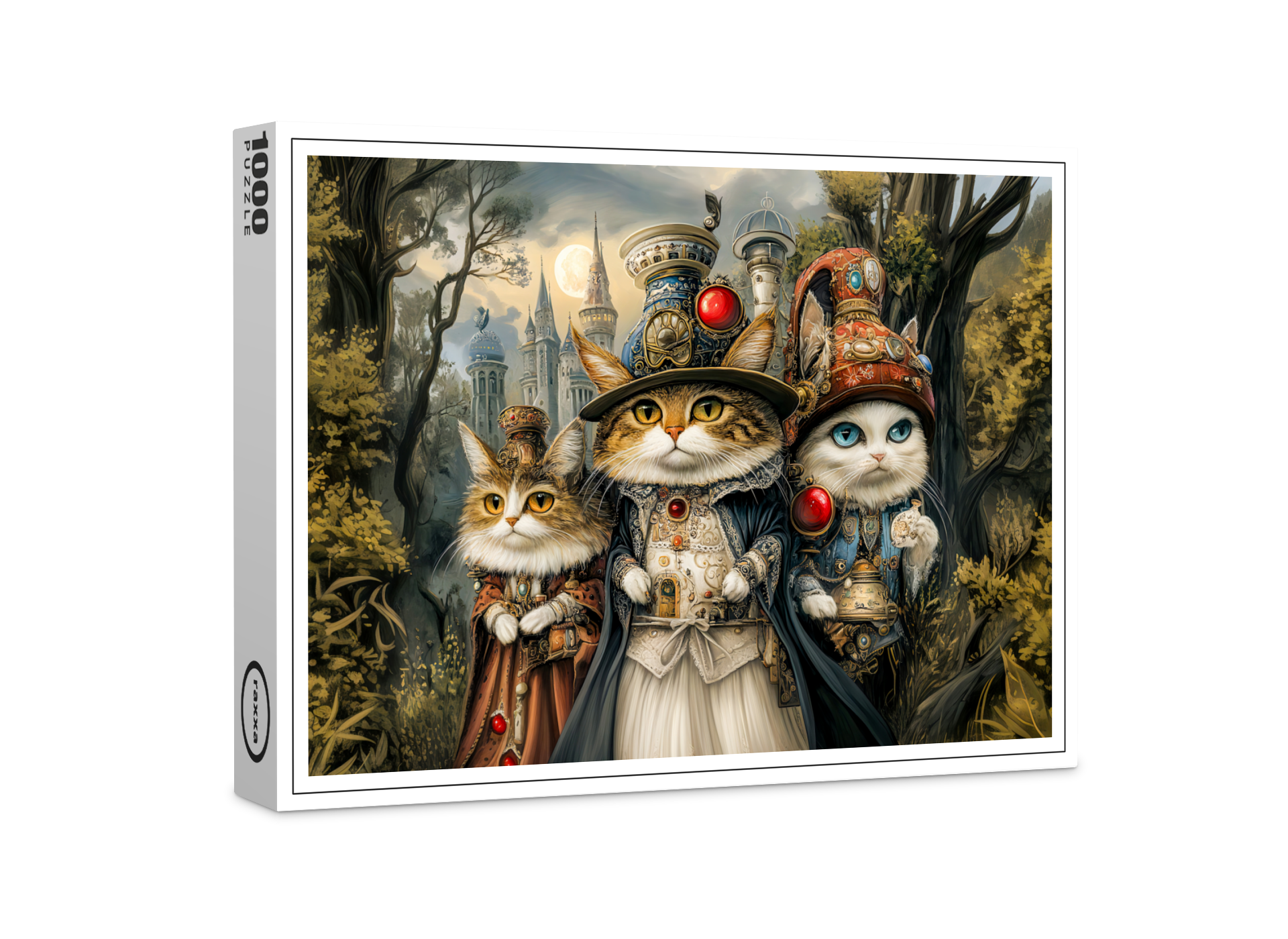 Illustration of three steampunk cats in fantasy attire, standing in a mystical forest with a castle backdrop under the moonlight. Detailed artwork in a whimsical fairy tale style