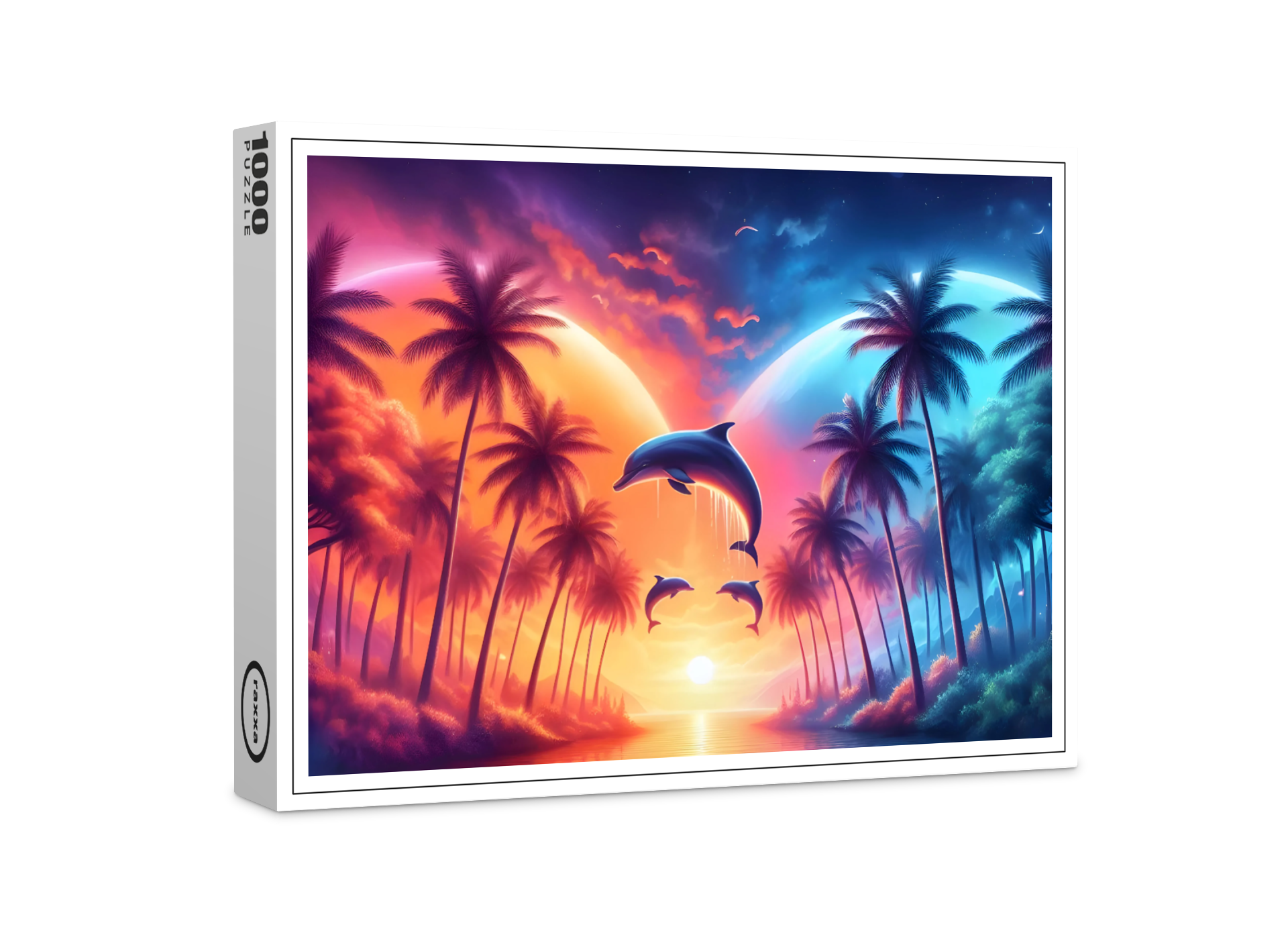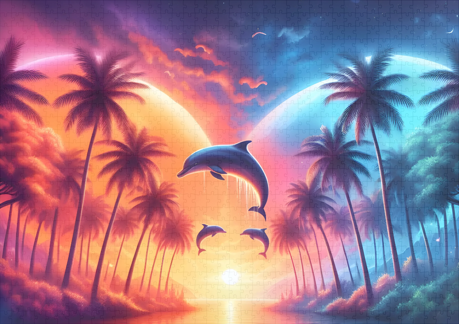 Auf dem Bild mit Delfinen, einem atemberaubenden Sonnenuntergang und majestätischen Palmen entfaltet sich eine Szene von unvergleichlicher Schönheit und Harmonie. Der Himmel brennt in den warmen Farben des Sonnenuntergangs, während die letzten Strahlen des Tages das Meer in goldenes Licht tauchen. Die Kombination aus den verspielten Delfinen, dem malerischen Sonnenuntergang und den im Wind flüsternden Palmen erzeugt eine Atmosphäre der Magie und des Friedens.