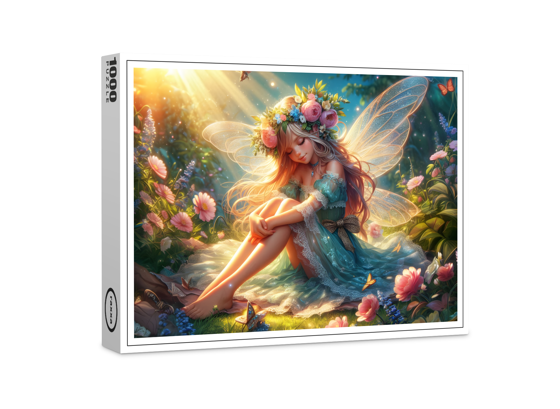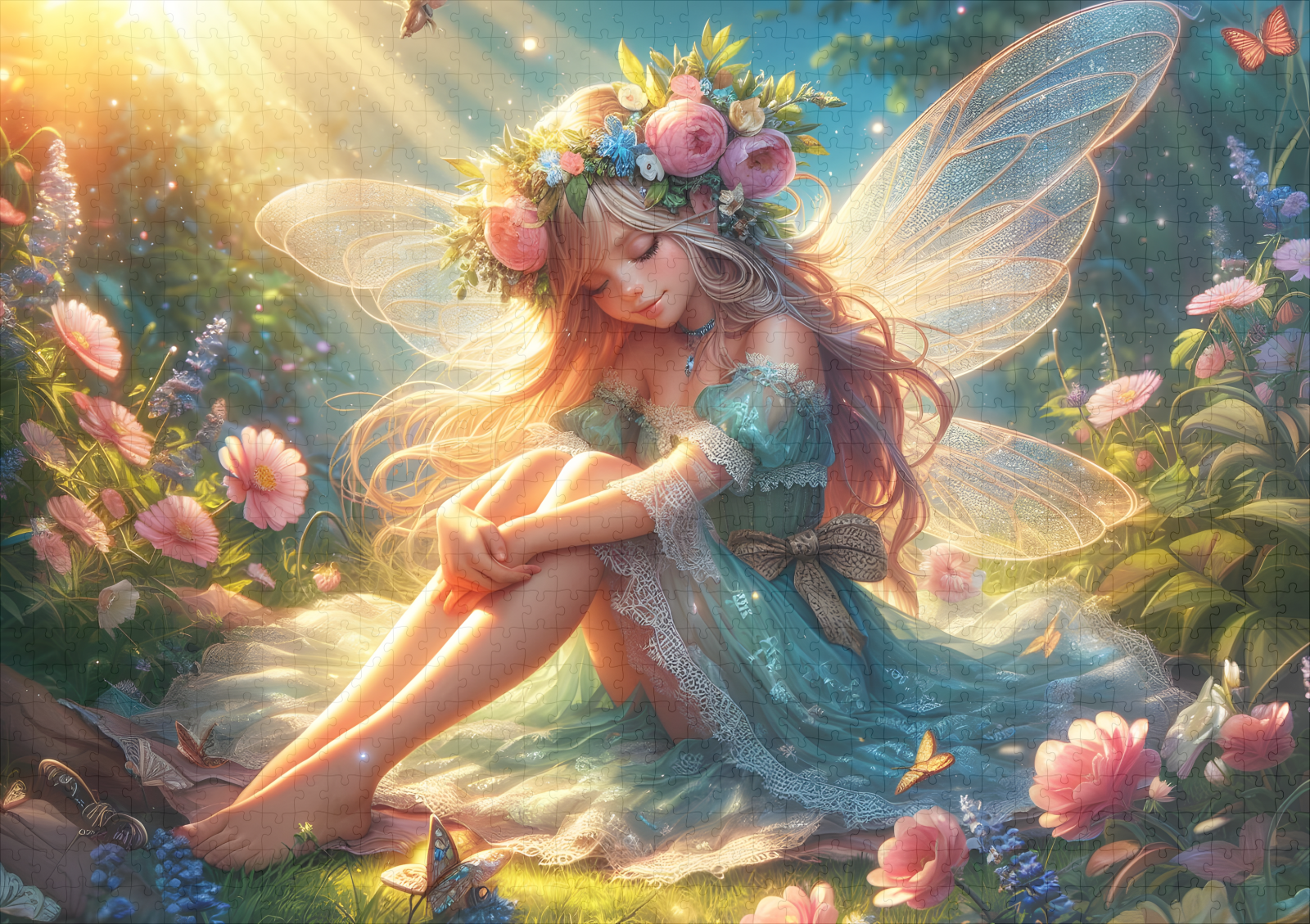 Une jeune fée aux longs cheveux blonds et à la délicate composition florale est assise, rêveuse, dans la forêt, entourée d'un bouquet de fleurs lumineuses. Ses ailes transparentes scintillent doucement tandis qu'elle se repose dans la lumière du soleil, les yeux fermés. Des rayons dorés percent la canopée et plongent la clairière dans une lueur chaude et magique, rendant la scène paisible et féerique.