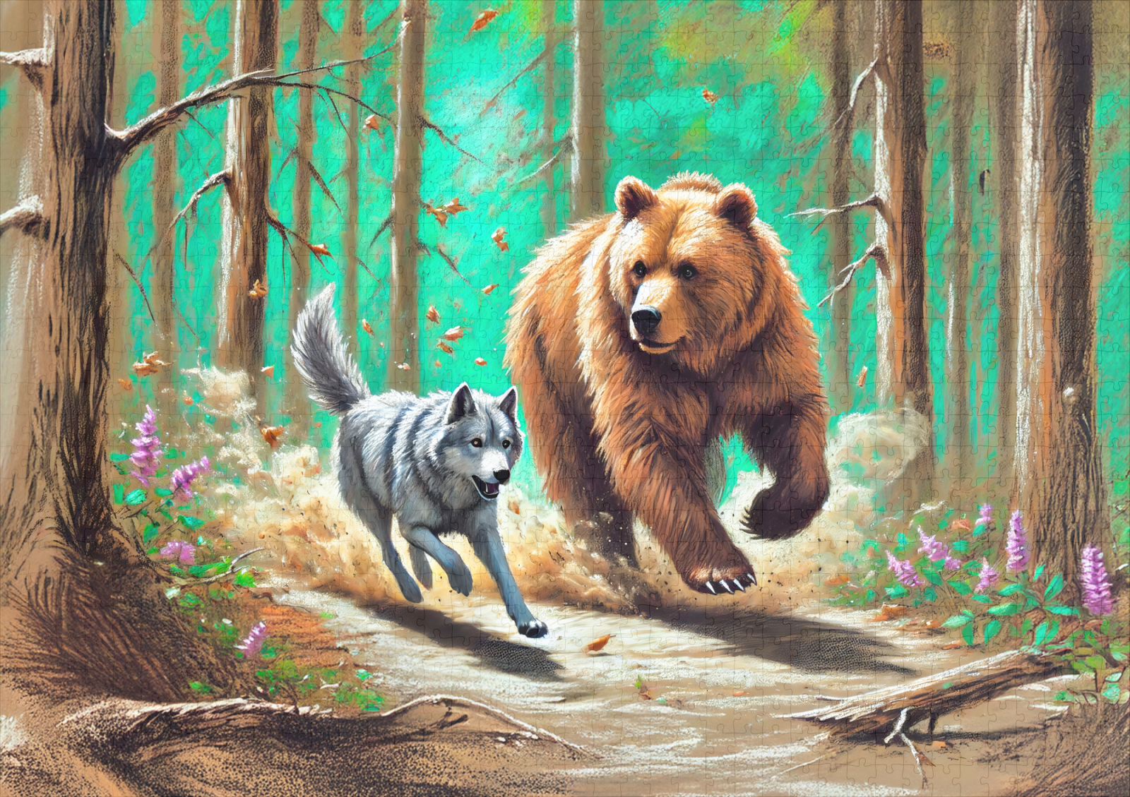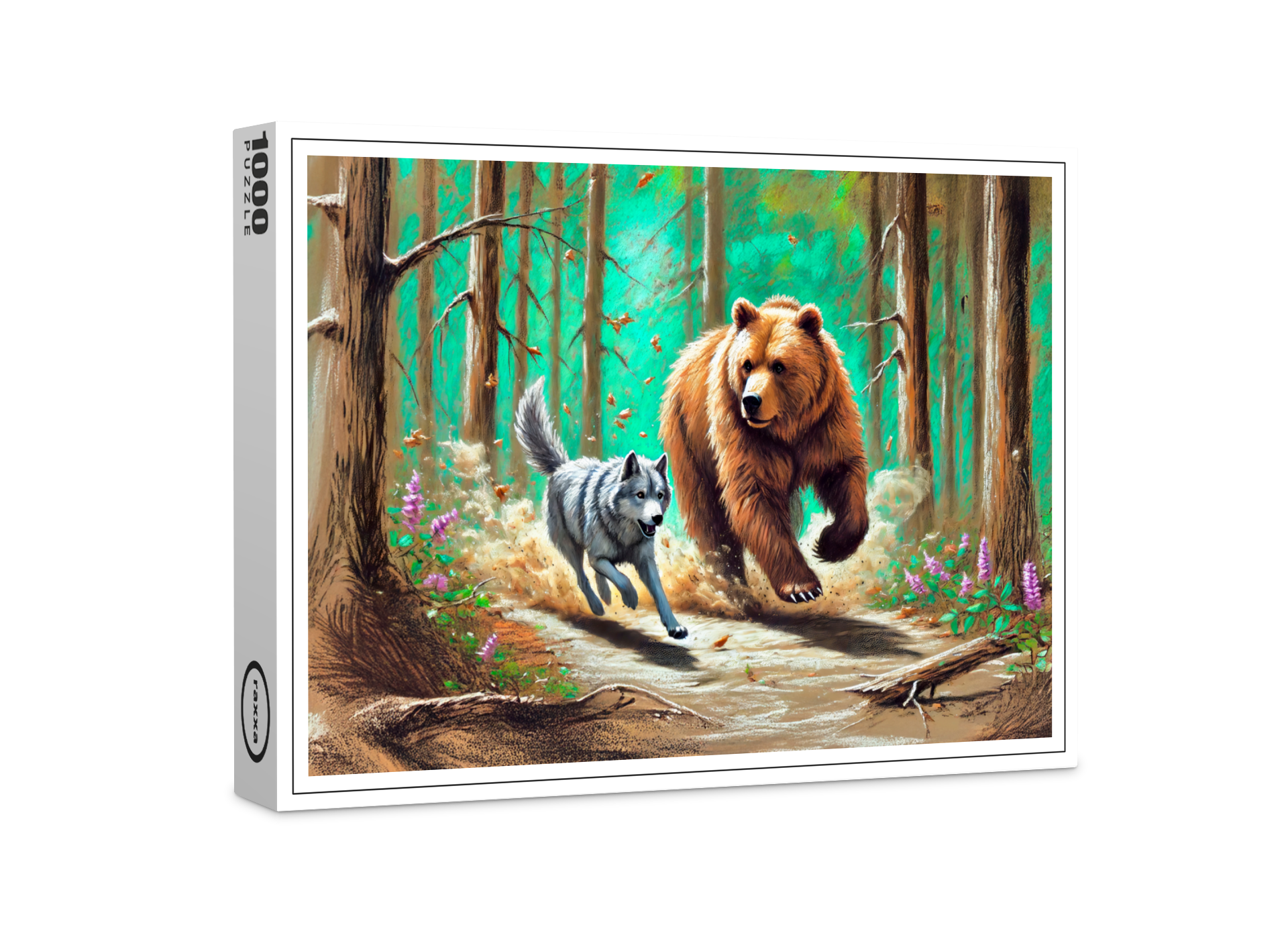 raxxa Premium-Puzzle: Wolf and Bear Chase Pastel Chalk Forest Scene