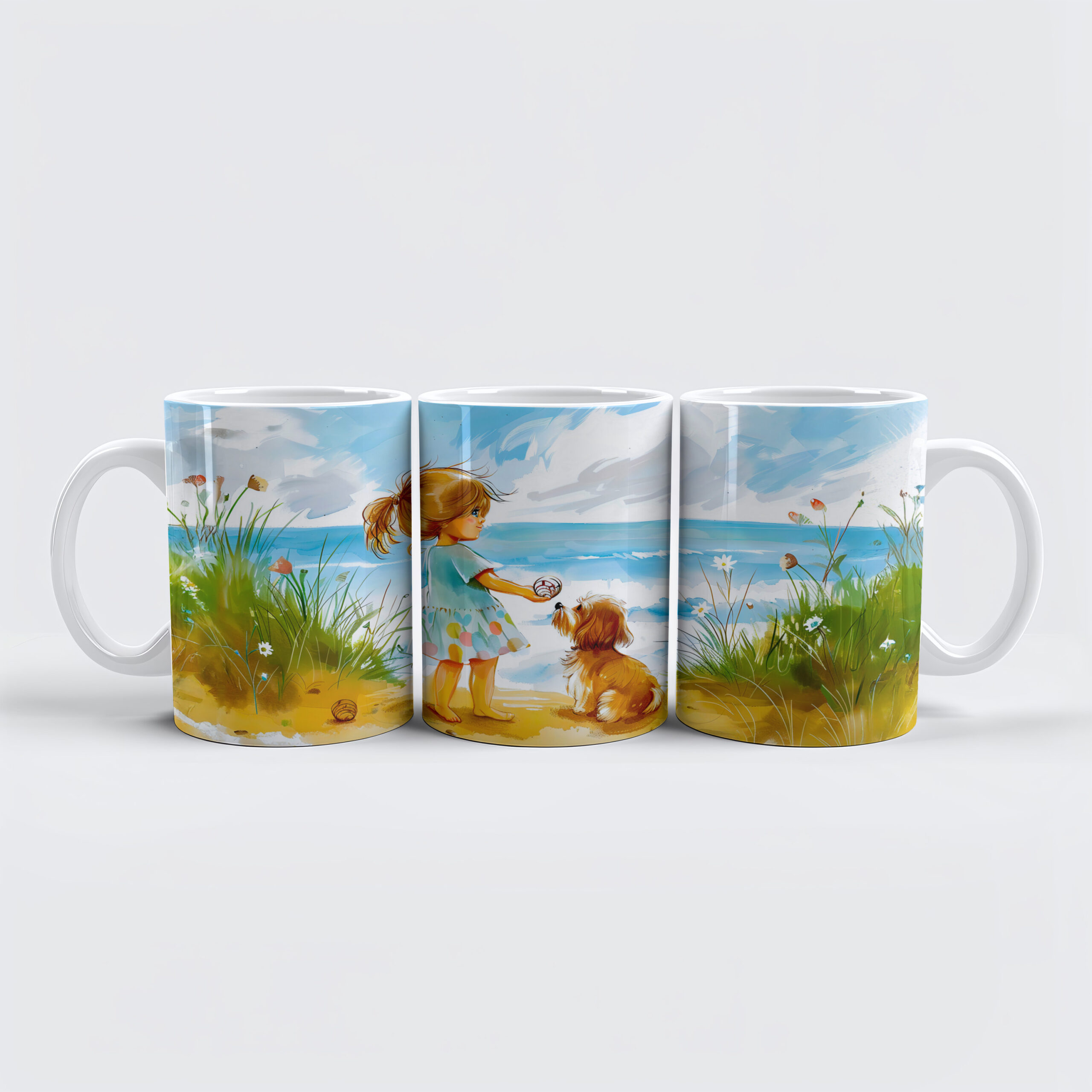 Watercolor painting of a young girl and her dog playing joyfully by the sea under a bright blue sky.