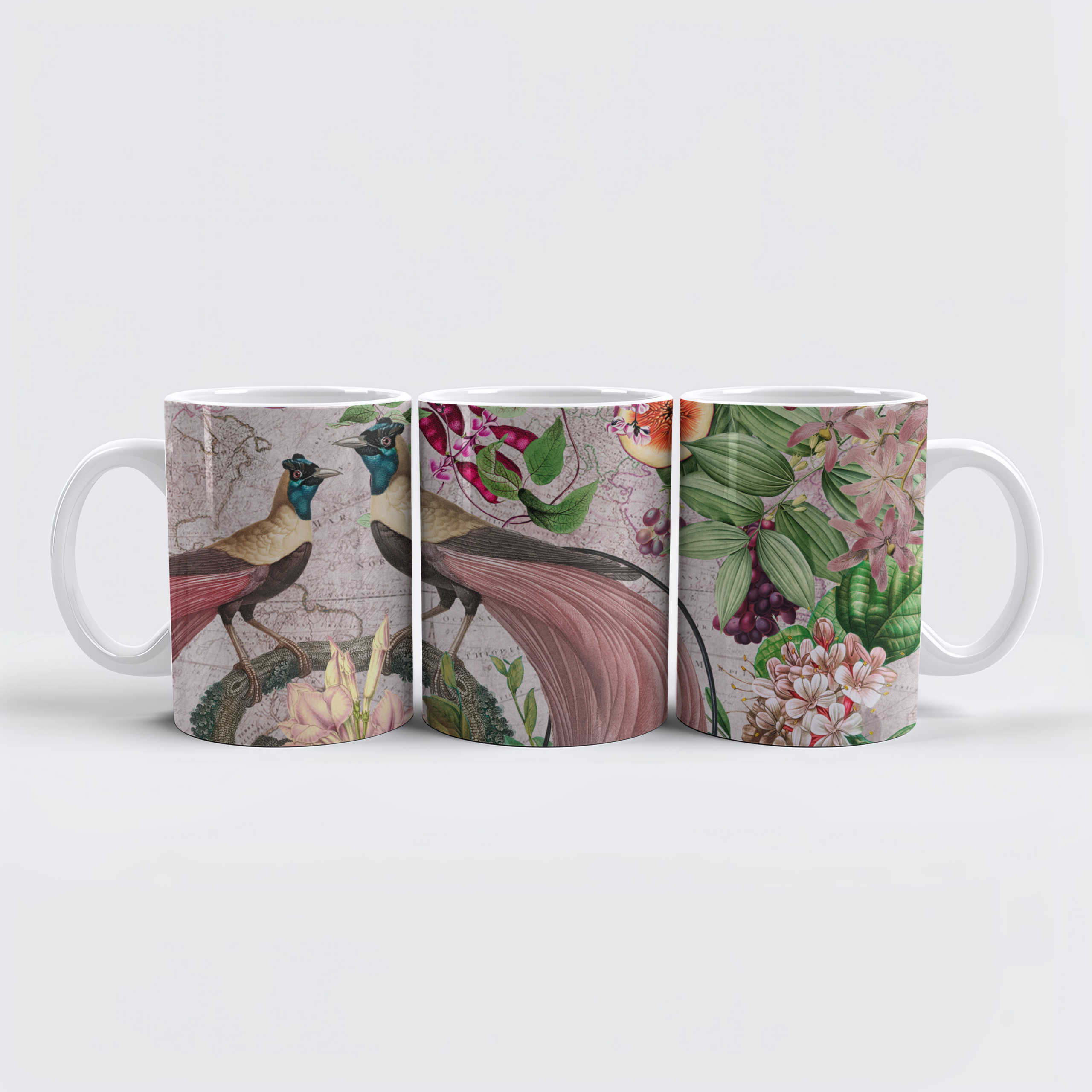 Cette illustration vintage met en scène 2 ravissants oiseaux de paradis, entourés d'un cadre luxuriant de fleurs et de feuilles anciennes. L'arrière-plan, d'une douce teinte rose, souligne l'ambiance tropicale et exotique de la scène. Le plumage des perroquets regorge de tons luxuriants et colorés et forme un contraste frappant avec le fond pastel délicat. Cette composition transporte le spectateur dans une époque révolue d'élégance et d'attrait pour les paradis tropicaux lointains et luxuriants. Les détails délicats et la palette de couleurs lumineuses font de cette illustration un instantané captivant de la beauté de la nature.