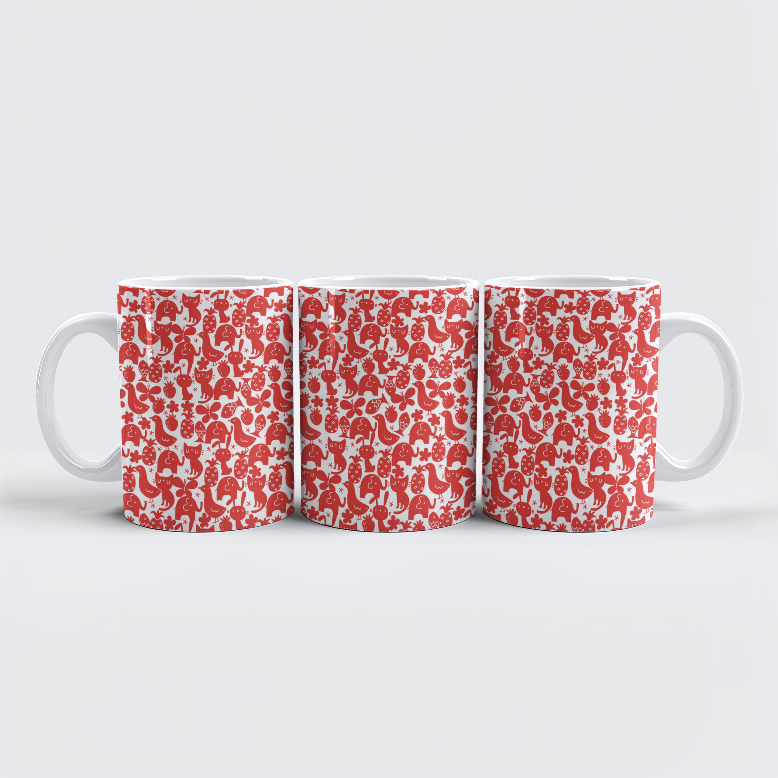 Ilustración de siluetas camufladas de animales y frutas en color rojo sobre blanco