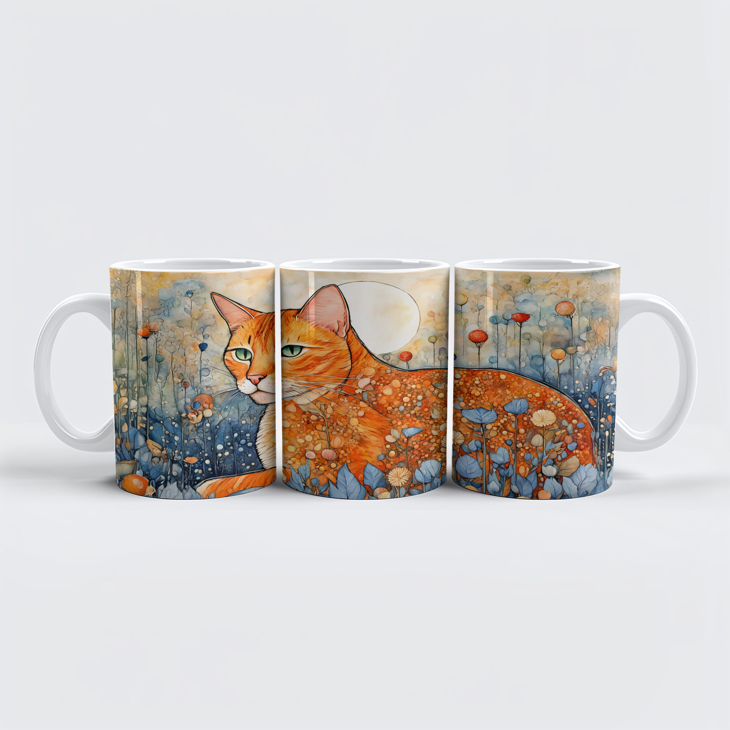 watercolor painting of an orange tabby cat lounging among delicate wildflowers. A warm, peaceful scene full of charm and texture.