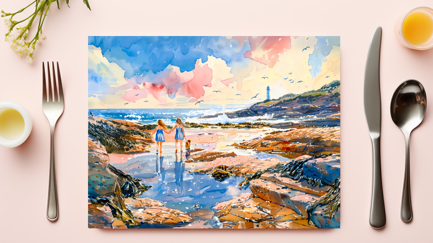 watercolor painting of two girls and their dog running along a rocky beach in summer, with a lighthouse in the background