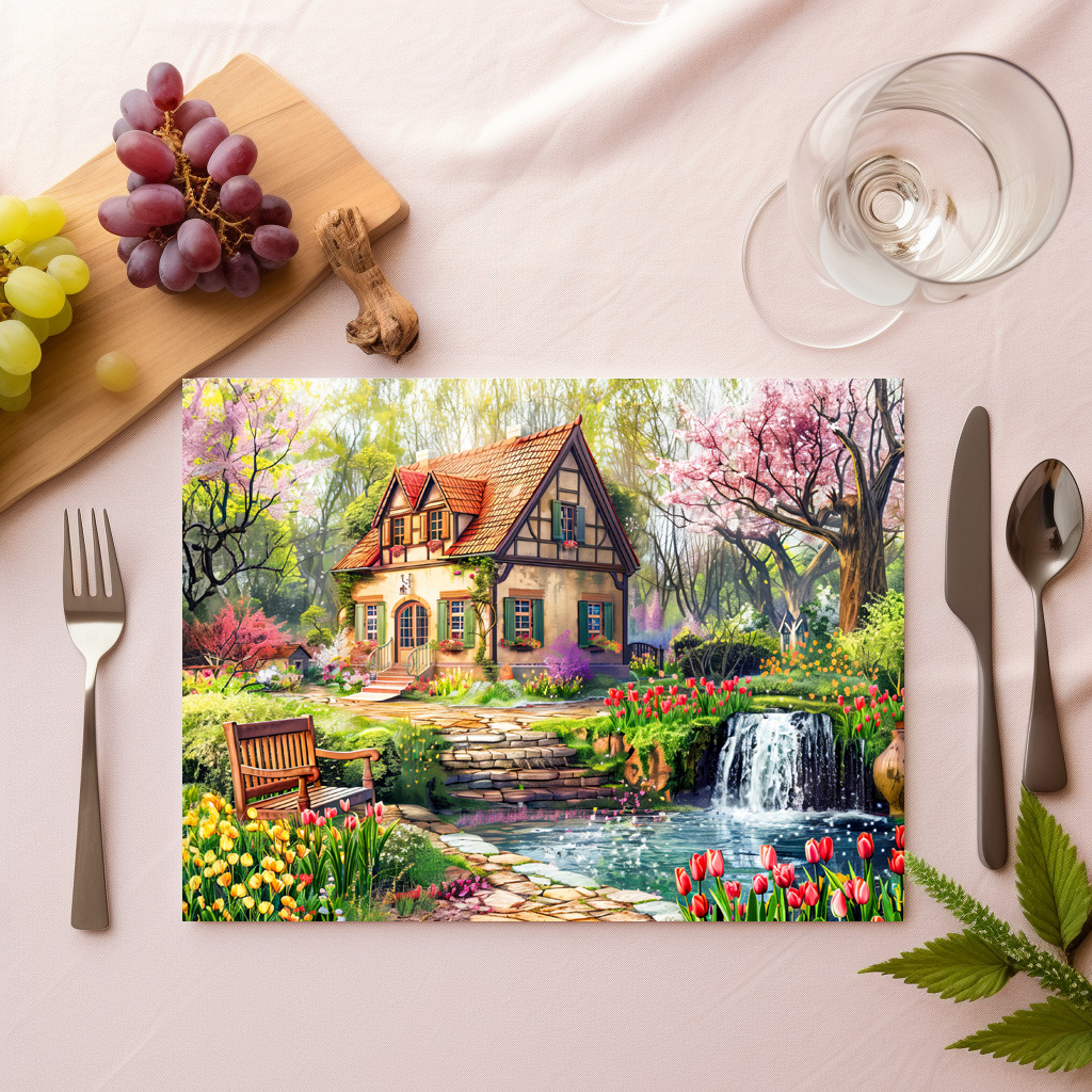 Delightful illustration of a cottage in spring with a vibrant tulip garden. A perfect scene of renewal and beauty, ideal for seasonal and floral-themed projects.