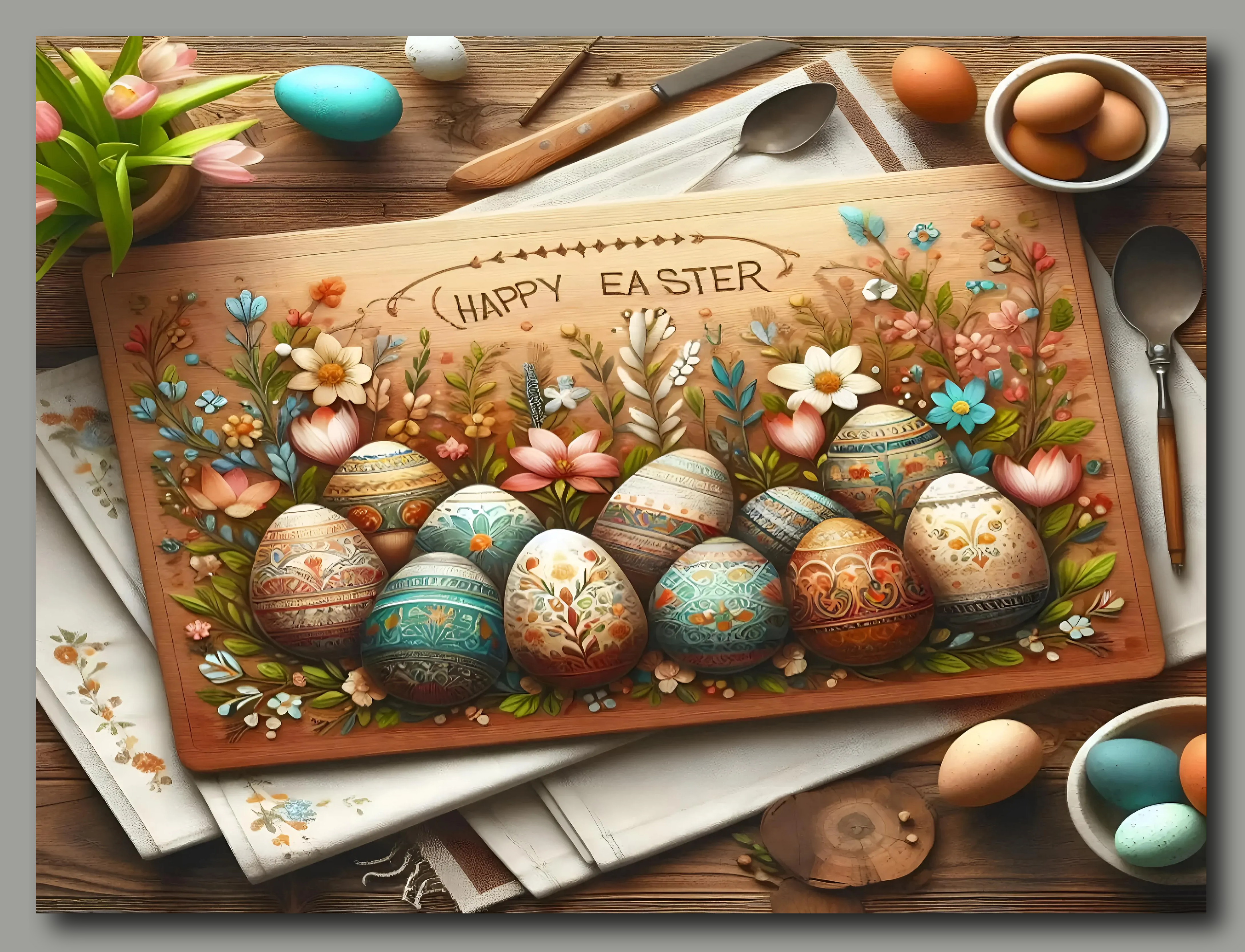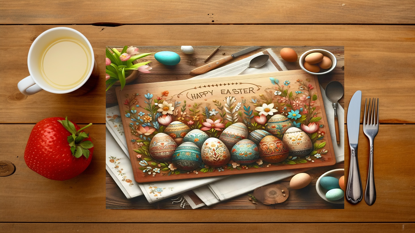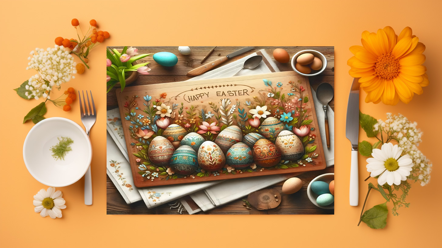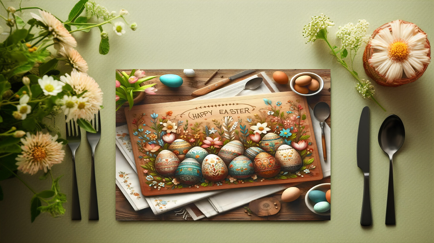 Sur la table se trouve un porte-place élégant, décoré d'œufs de Pâques multicolores et de joyeux motifs de Pâques. Les couleurs vives confèrent à la scène une atmosphère festive, tandis que la composition artistique éveille l'anticipation de la fête de Pâques.