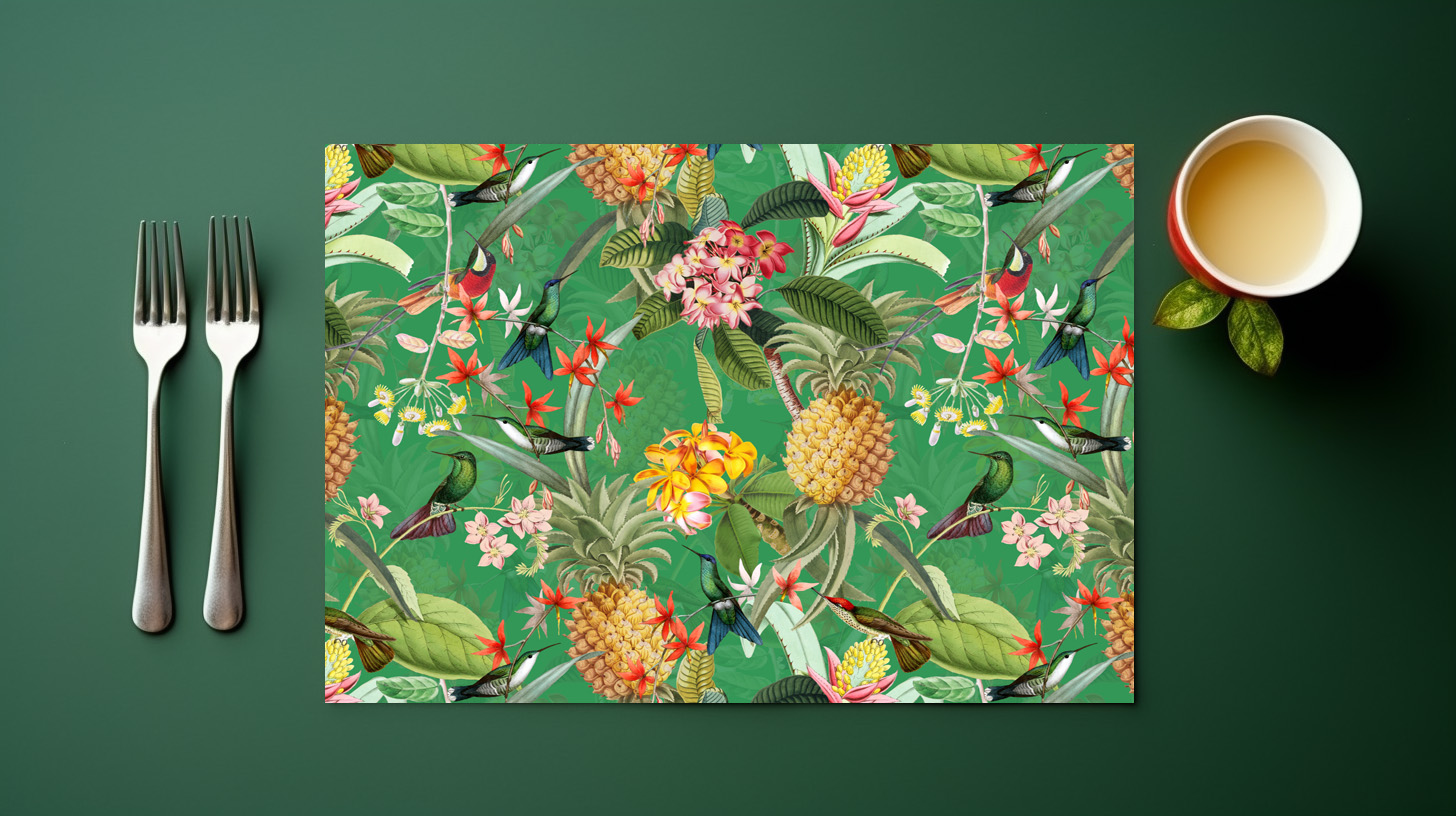 Un motif vintage exotique, inspiré de la splendeur tropicale, présente des ananas luxuriants et des colibris colorés sur un fond vert profond. Les ananas, avec leur or lumineux et leurs feuilles exotiques, confèrent au design une touche de luxe et d'exotisme. Les colibris, avec leurs couleurs vives et leurs mouvements de vol rapides, apportent une énergie ludique au motif. Le fond vert profond représente la nature luxuriante de la jungle et crée une toile de fond vivante pour cette représentation exotique. Ce motif dégage une atmosphère intemporelle et luxueuse et invite les spectateurs à se plonger dans le monde de la beauté tropicale et de la faune fascinante.
