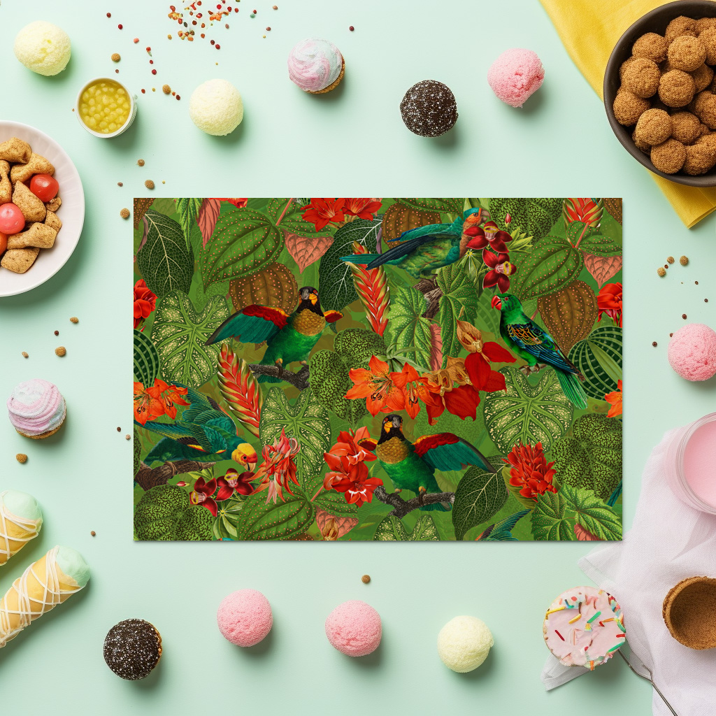 Un motif vintage vert foncé, inspiré de l'exotisme tropical, présente une scène vivante. Sur le fond vert profond, des fleurs orange vif s'épanouissent avec une splendeur exquise et confèrent au motif une note intense et vivante. Des perroquets exotiques, aux couleurs vives et aux plumes exotiques, ornent le dessin et lui confèrent une vivacité enjouée. Ce motif capture la beauté luxuriante de la nature tropicale et dégage une élégance exotique qui séduit les sens et transporte dans un monde plein de couleurs et de vitalité.