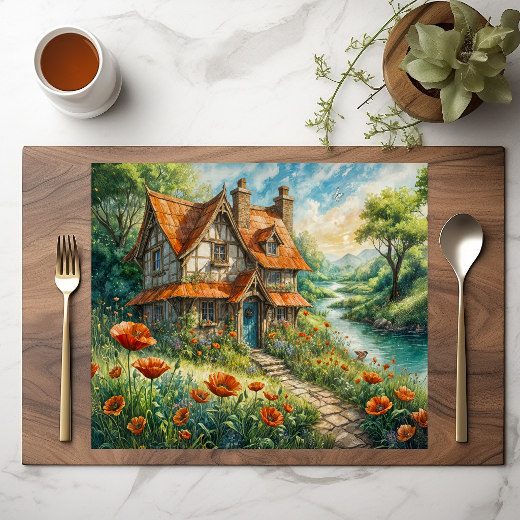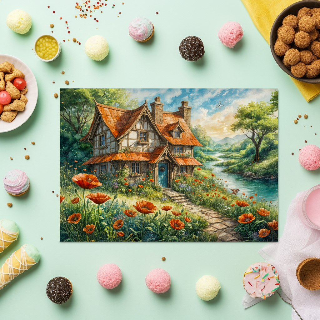 charming cottage nestled in a vibrant garden of poppies, surrounded by lush greenery and blooming flowers, creating a serene and magical atmosphere.