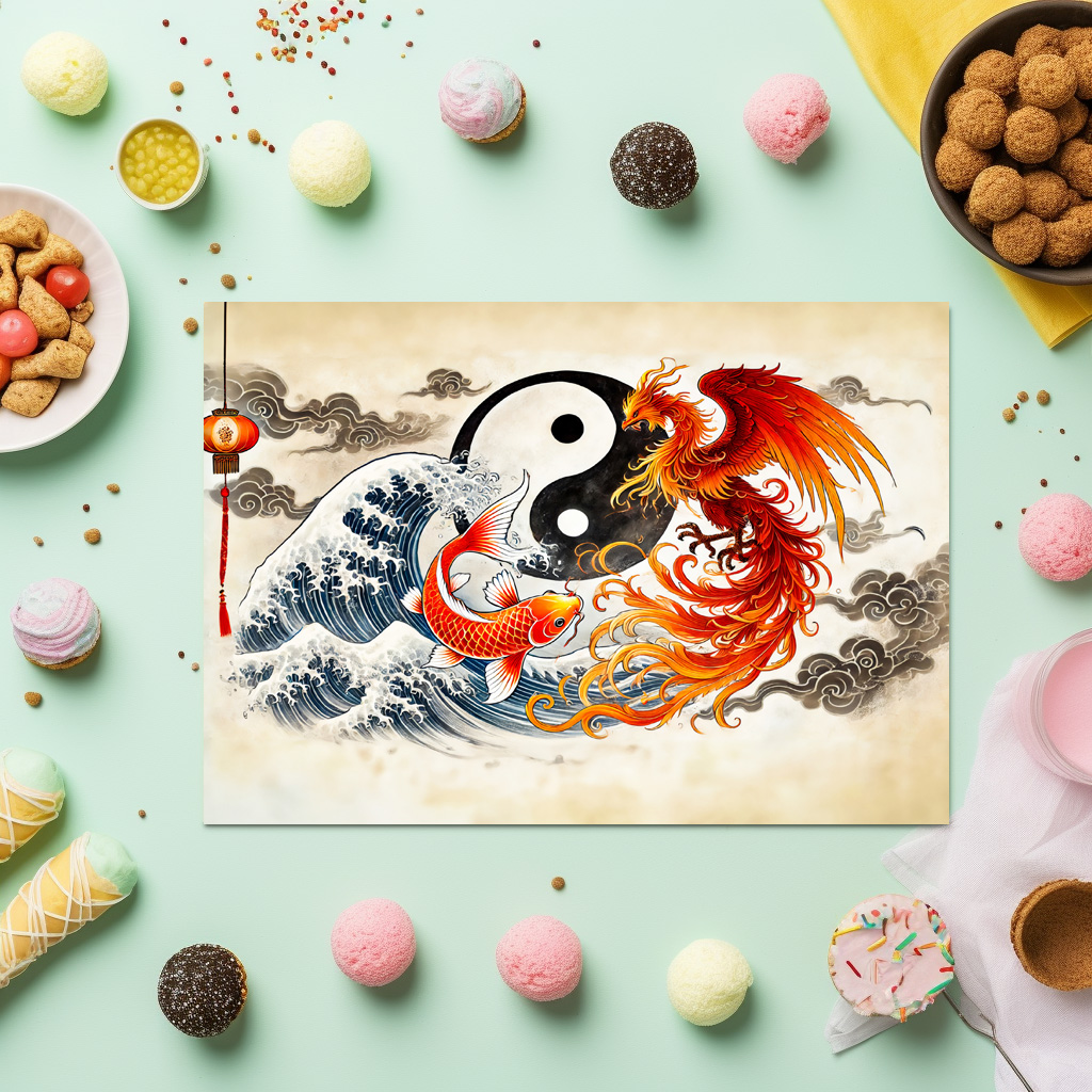 koi and phoenix merge in a dynamic Yin-Yang composition, symbolizing transformation and rebirth, painted in a traditional Asian art style.