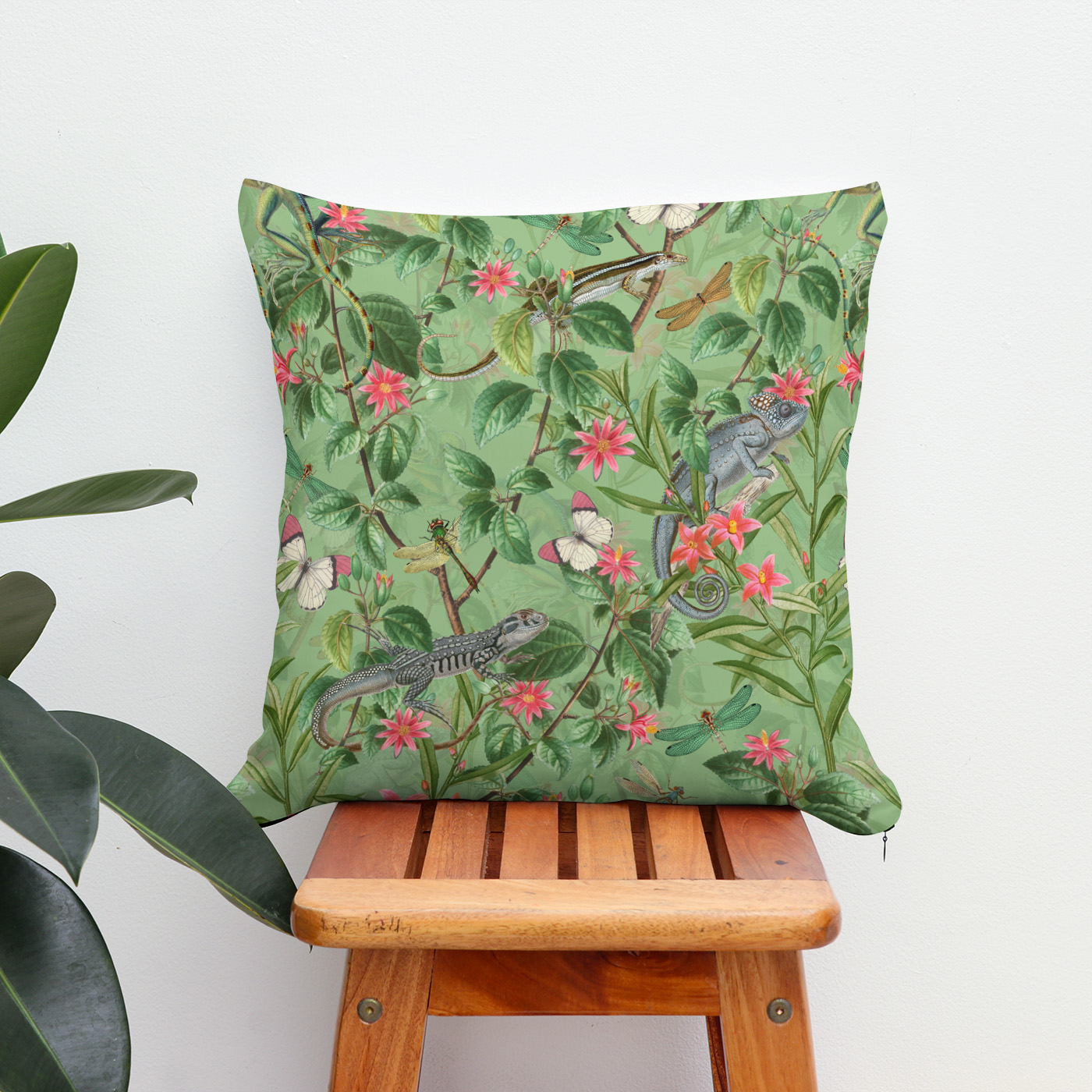 raxxa Cuscino Premium Viaggio nel tempo tropicale - Gechi vintage nella giungla di fiori