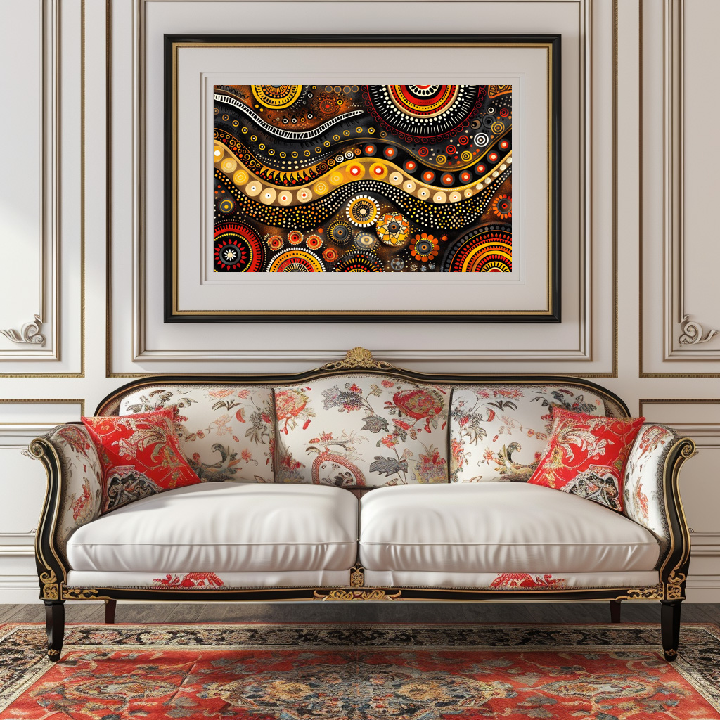 Fließende Linien, konzentrische Muster und warme Erdtöne – inspiriert von der Traumzeit-Kunst der Aborigines. Die Komposition verbindet Bewegung, Natur und Symbolik auf ästhetische Weise.