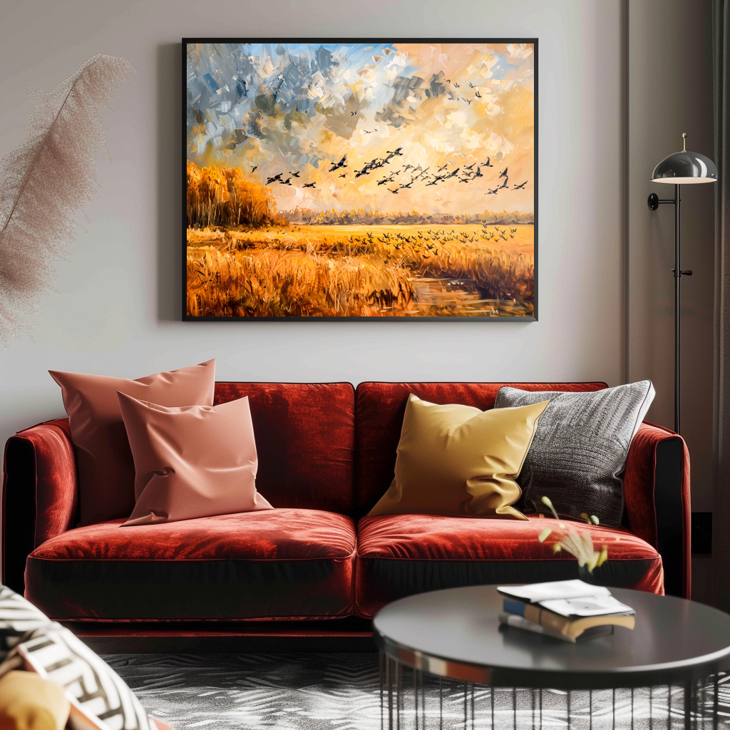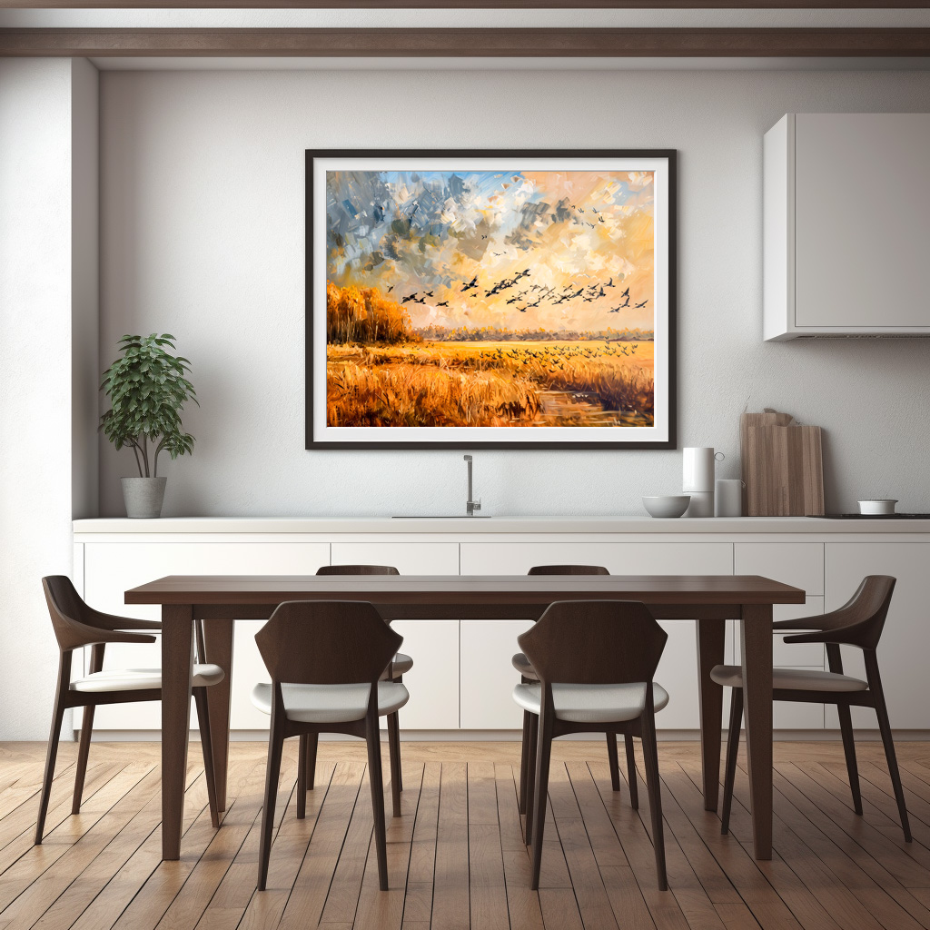 A serene autmn scene with birds flying over a snowy field. The impressionistic style captures the tranquility and beauty of the season, creating a peaceful and inviting atmosphere.