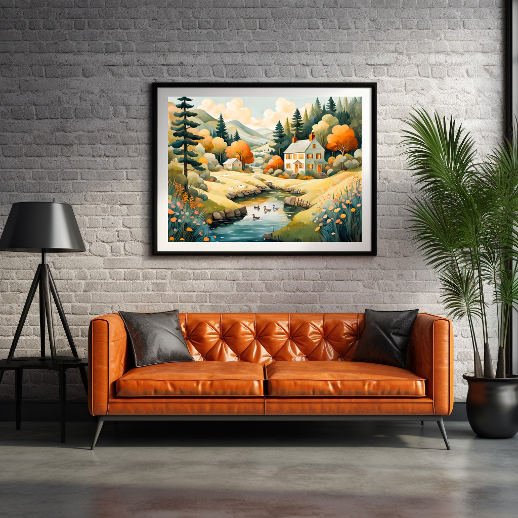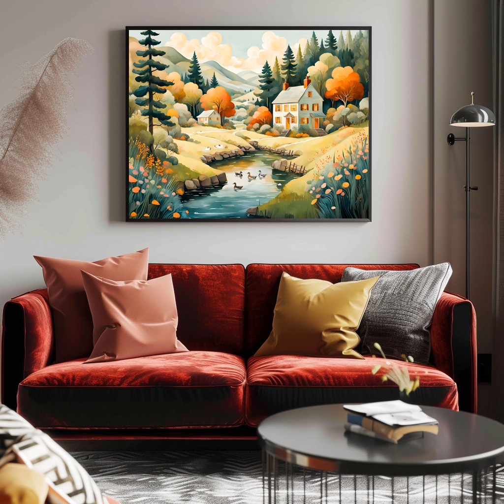 charming house by a tranquil pond with ducks, set in a picturesque mountain idyll during autumn. The scene captures the serene beauty of the season with warm, earthy tones.