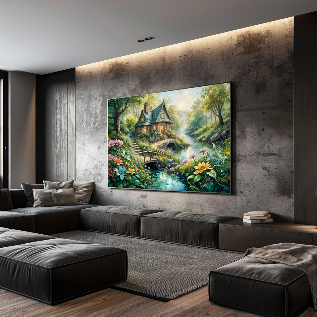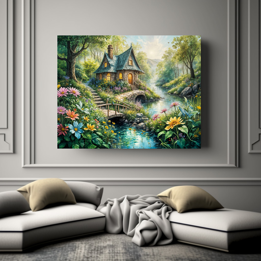 picturesque cottage nestled by a tranquil stream, surrounded by lush greenery, vibrant flowers, and a wooden bridge, creating a magical and peaceful atmosphere.