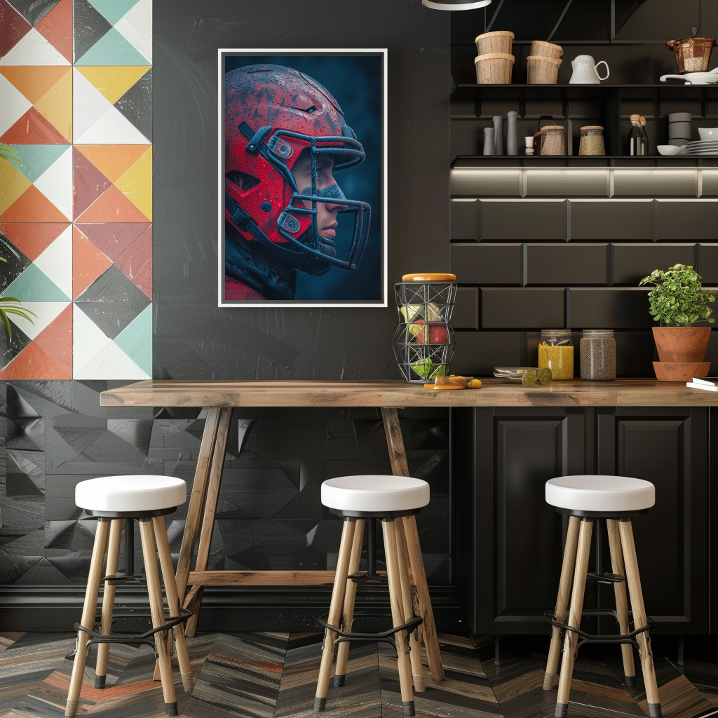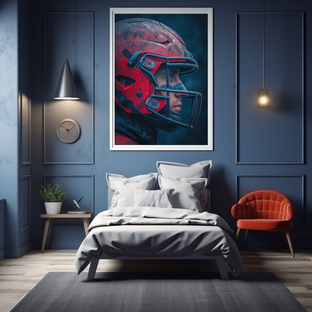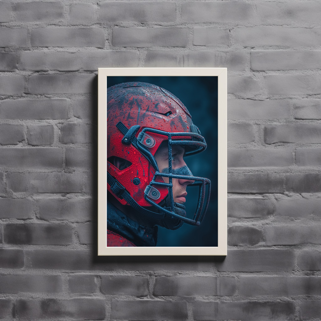 Der American Football-Spieler in einem nassen, roten Helm. Der Helm und die ernste Miene des Spielers erzeugen eine intensive und dramatische Atmosphäre.