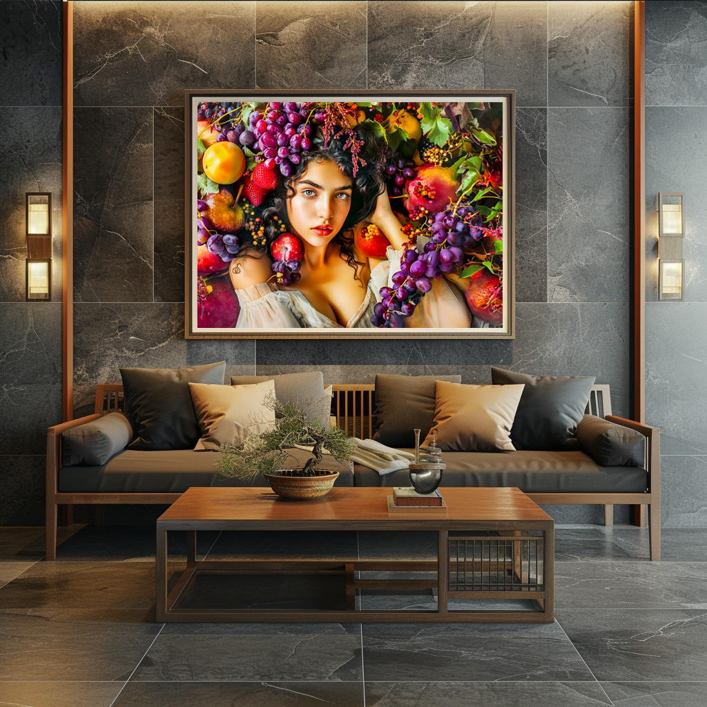 A woman poses with a crown of grapes, pomegranate fruits and flowers, surrounded by lush produce and blossoms. The portrait blends elegance and natural beauty in vivid composition.
