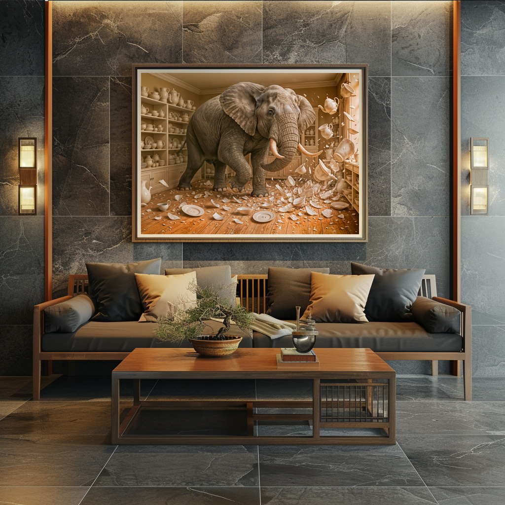 A photorealistic elephant storms through a delicate porcelain shop, knocking over shelves and fine china. A vivid and humorous take on the saying bull in a china shop but even bigger.