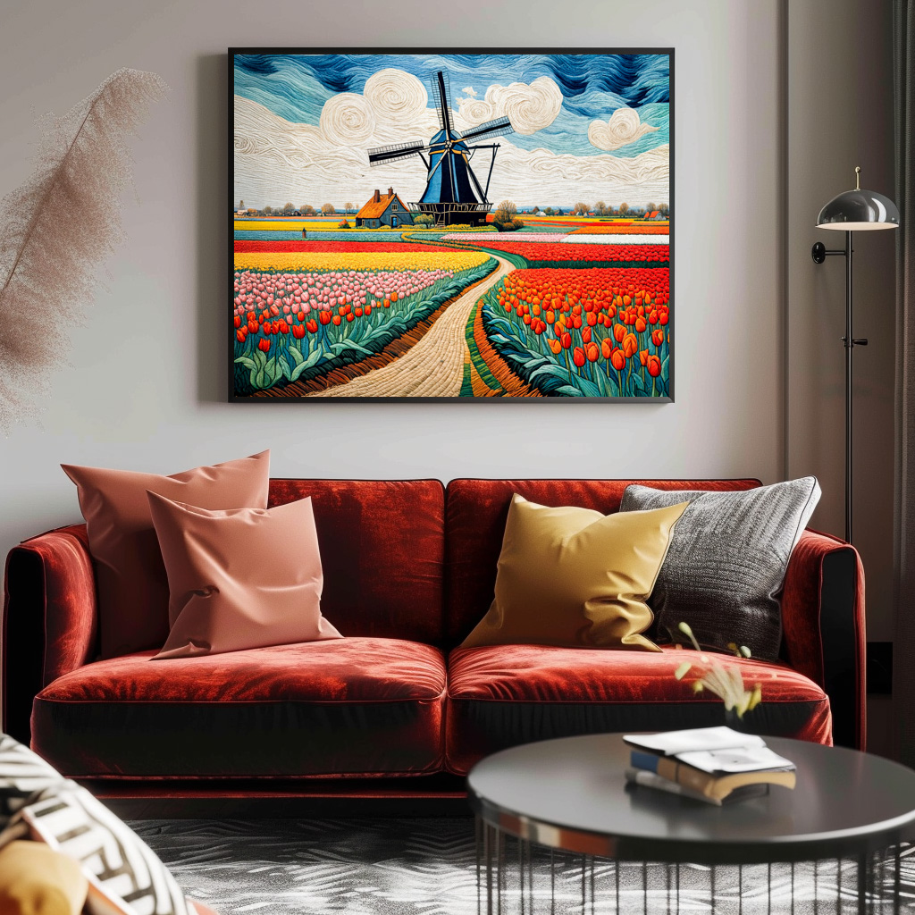 A historic windmill set against a backdrop of blooming countryside, evoking a sense of nostalgia and rural charm. Ideal for classic and timeless decor.