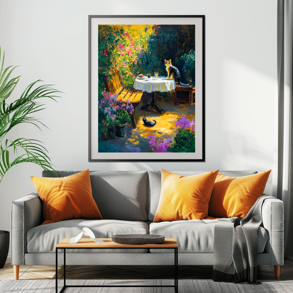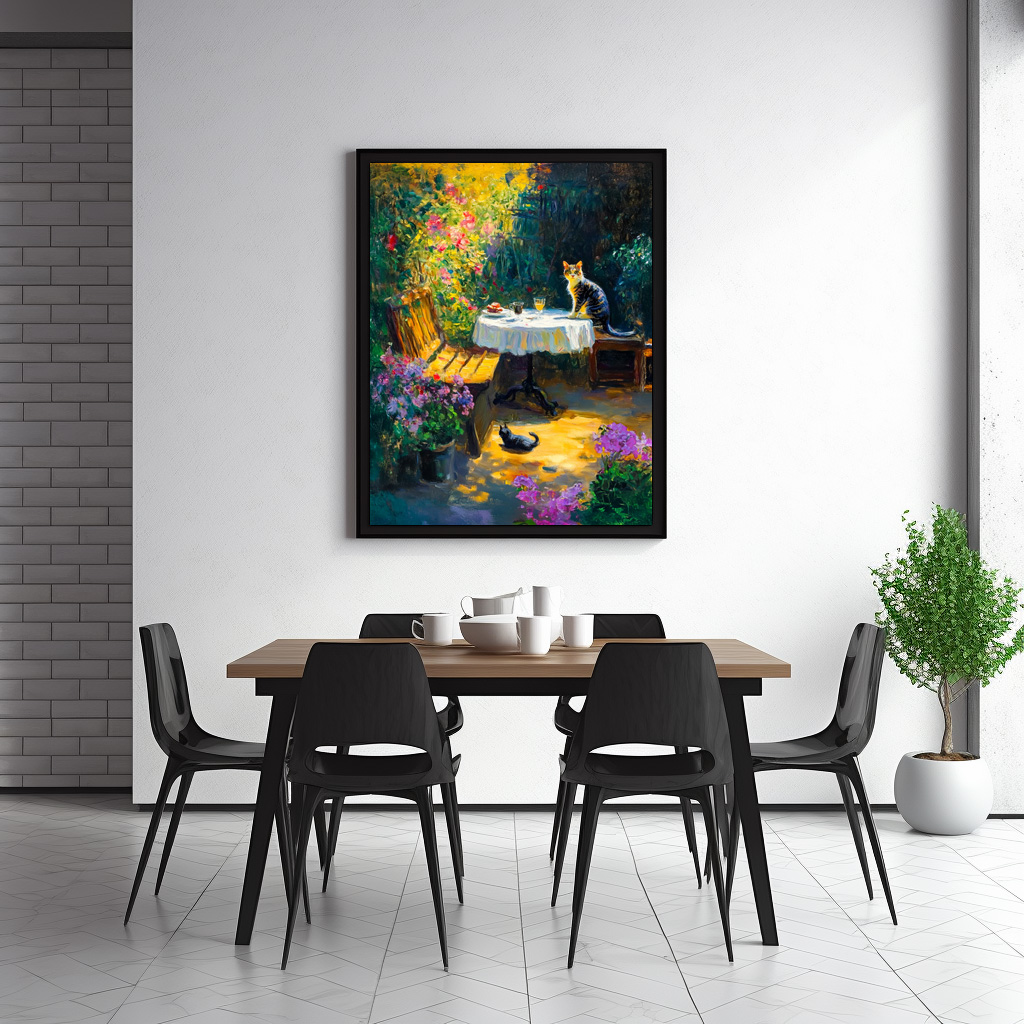 An impressionistic oil painting of two cats playing in a summer garden corner with a rustic table and wooden bench. A joyful depiction of feline curiosity and charming outdoor scenery.